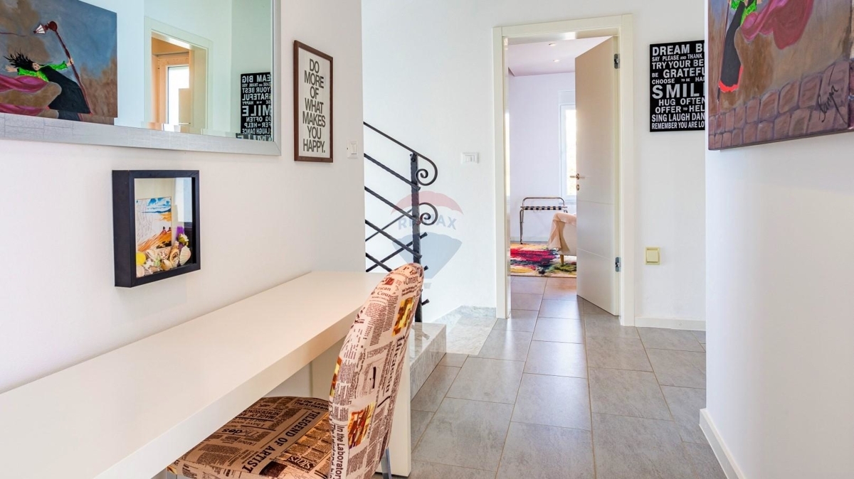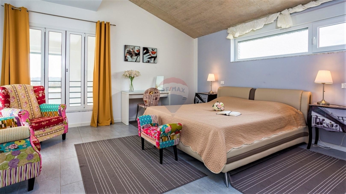 Im Obergeschoss befinden sich drei Schlafzimmer, ein Fitnessbereich und zwei Badezimmer. Ein Schlafzimmer davon verfügt über ein Ankleidezimmer und eine Terrasse mit Meerblick.
