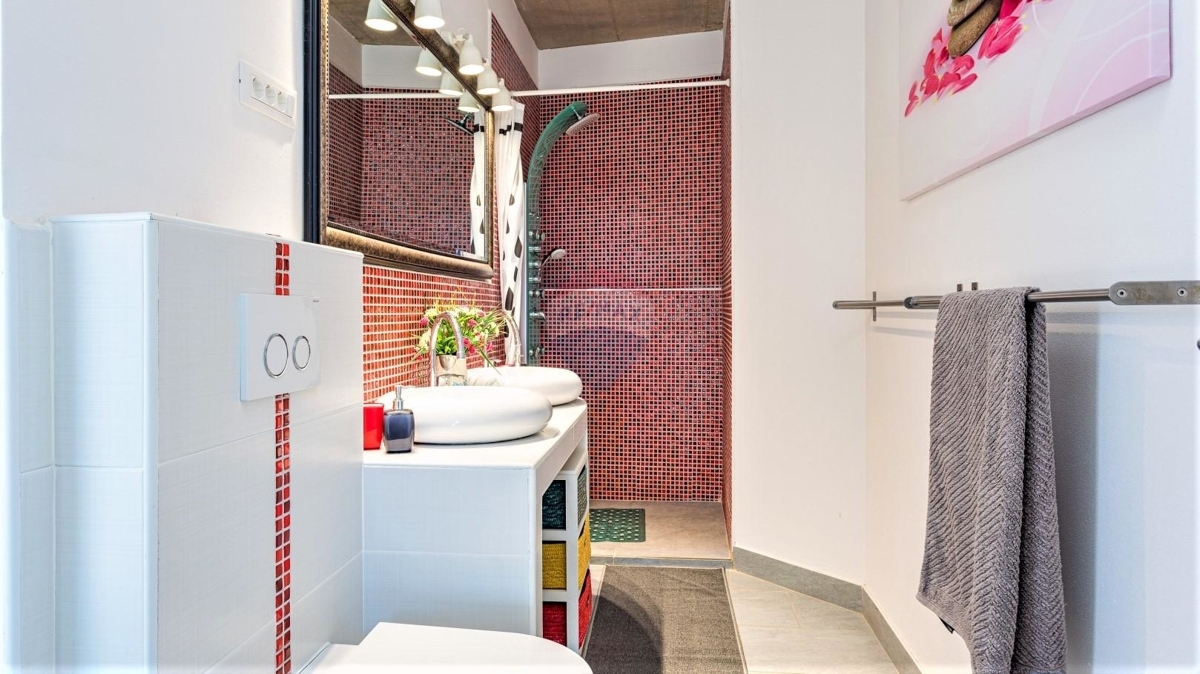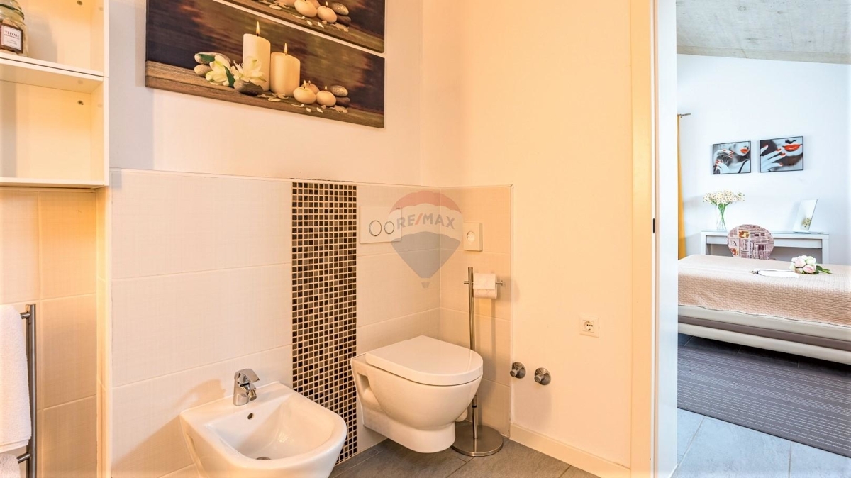 Das Erdgeschoss besteht aus einem offenem Wohn-Ess-Bereich mit einer voll ausgestatteten Küche. Ein großes Schlafzimmer mit eigenem Bade- und Ankleidezimmer, sowie ein Gäste-WC runden das Geschoss ab.