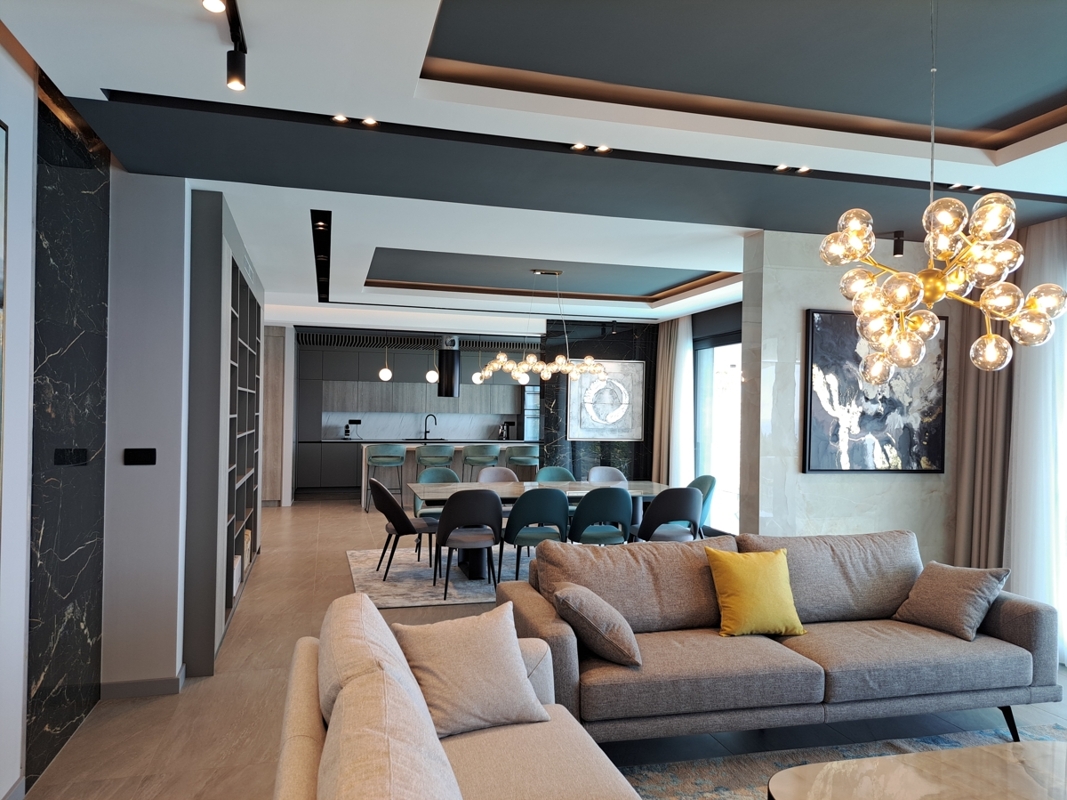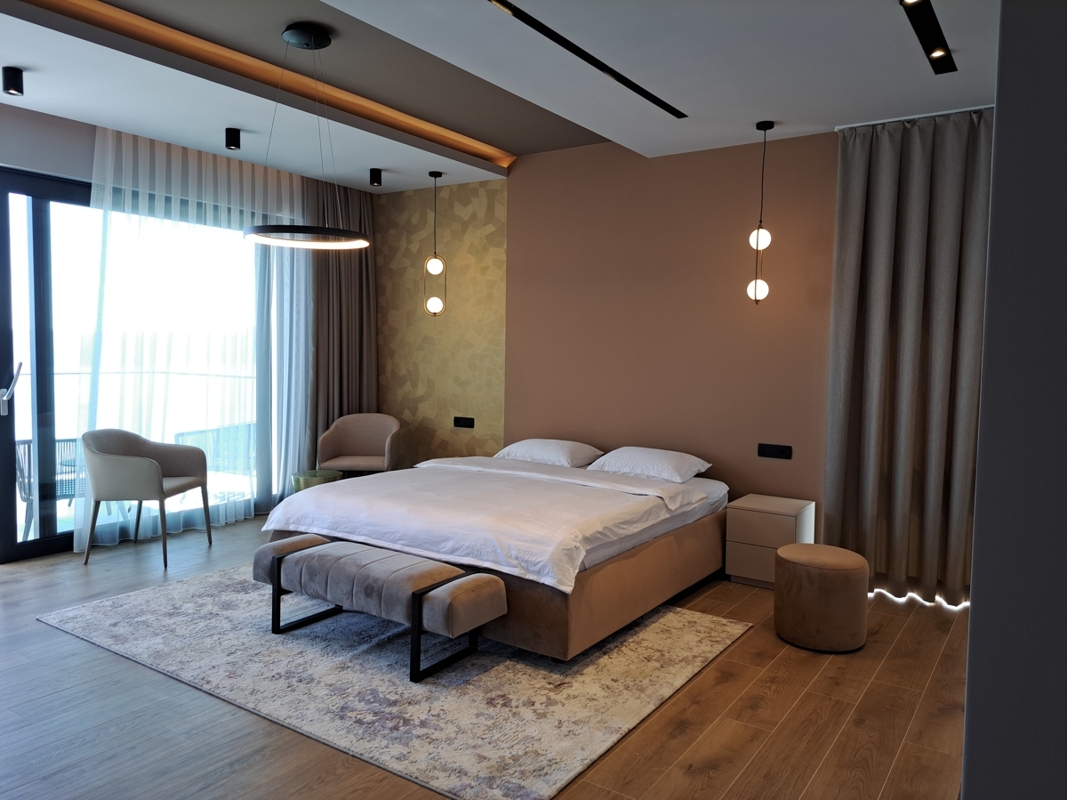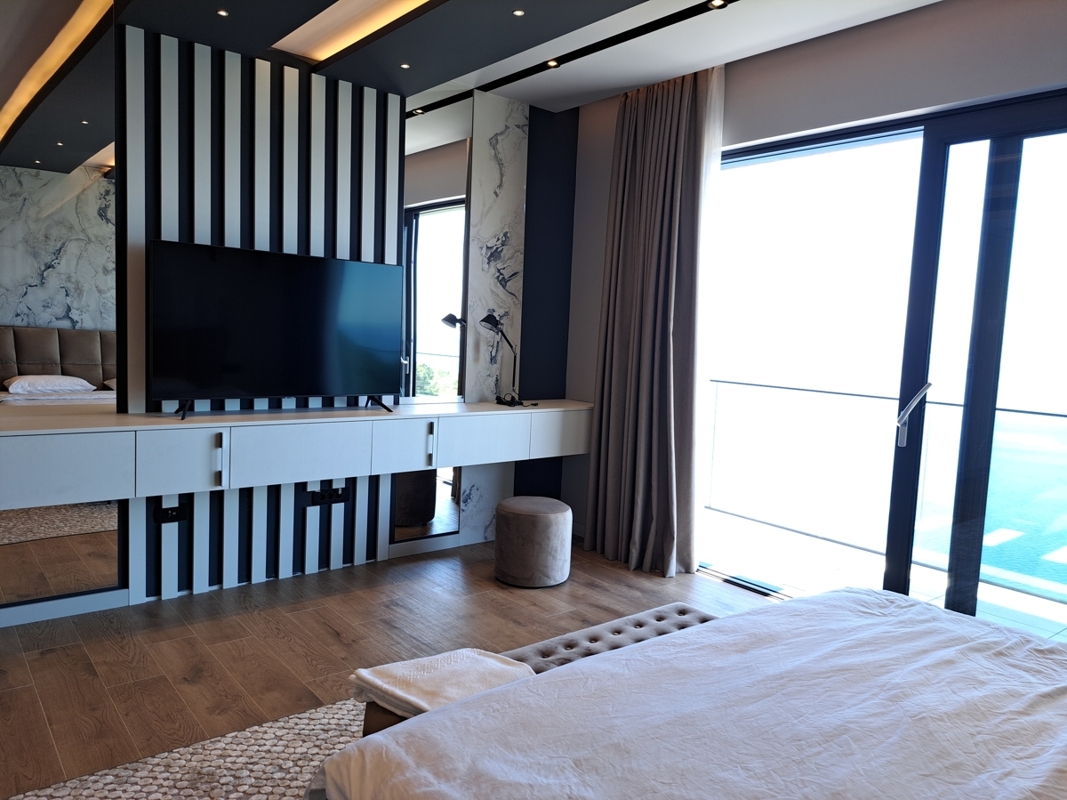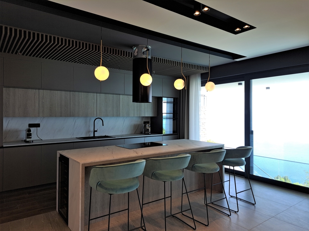 Das Erdgeschoss wird von einem offenen Wohn-Ess-Bereich mit vollausgestatteter Küche dominiert – ein Gäste-WC rundet das Stockwerk ab. Die Räume sind lichtdurchflutend und bieten einen traumhaften Ausblick auf das Meer.
