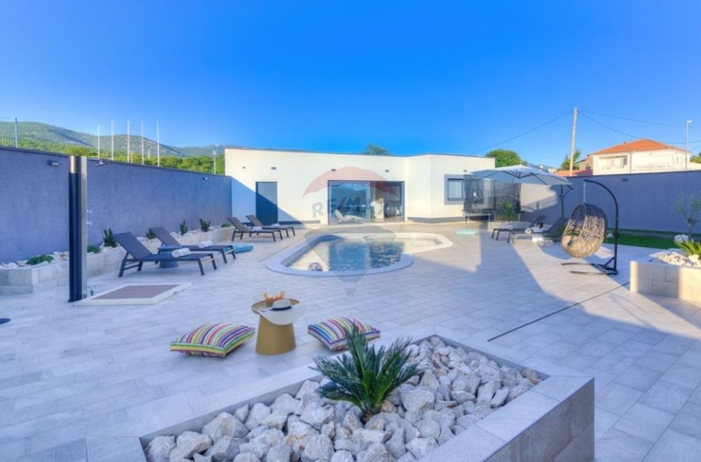Der Außenbereich wurde dekorativ angelegt und ist pflegeleicht gestaltet. Er bietet eine große, überdachte Terrasse, einen 32m2 großen Pool mit Sonnendeck.