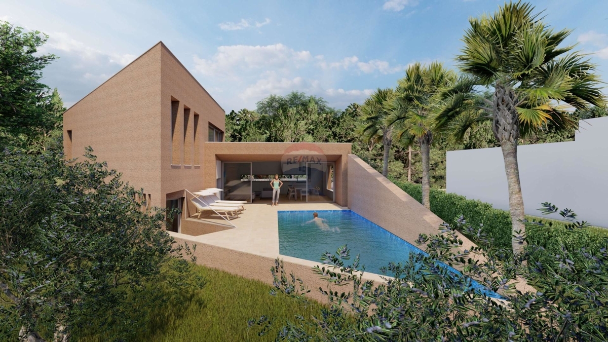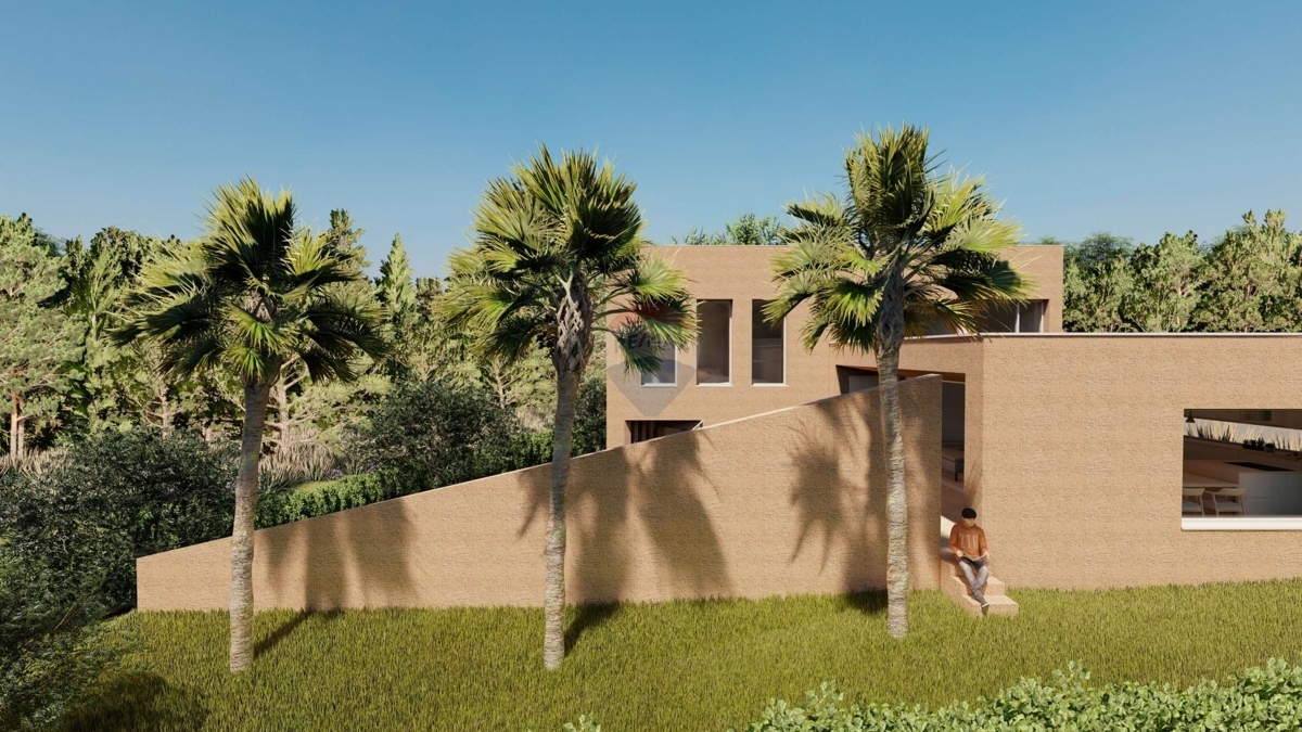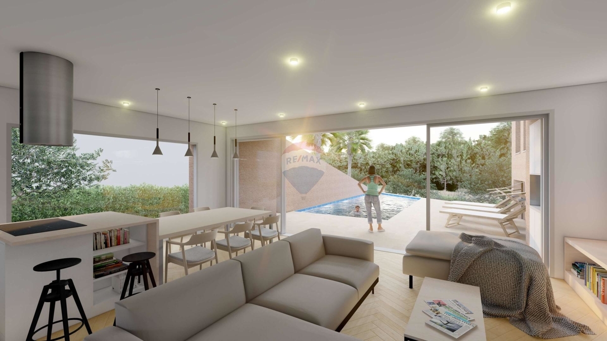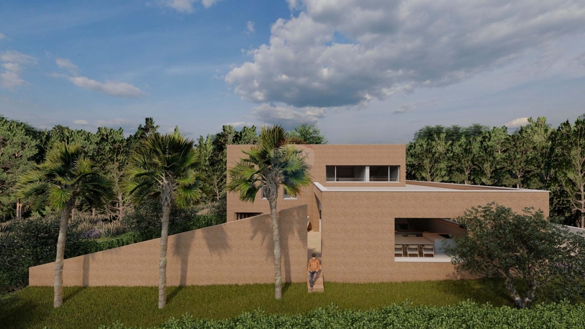 Im Erdgeschoss dominiert ein offener Wohn-Ess-Bereich mit Küche und direktem Ausgang zur überdachten Terrasse. Hier befinden sich zwei Schlafzimmer, ein Badezimmer und ein Gäste-WC.