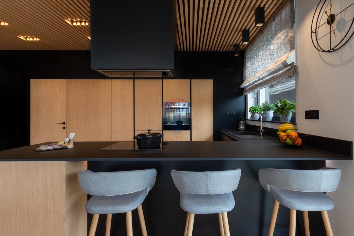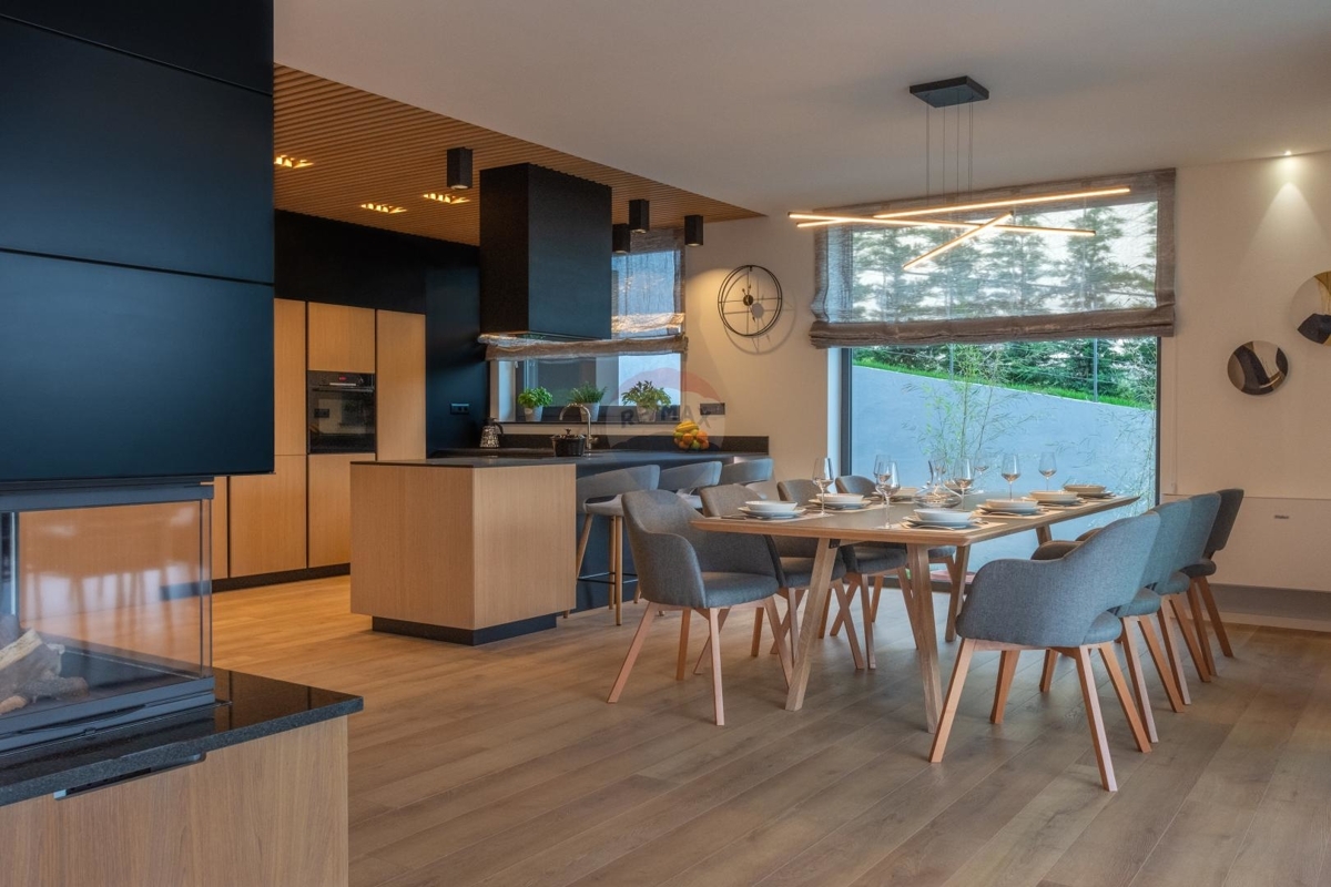 Das Erdgeschoss bietet ein geräumiges Wohnzimmer mit Kamin, dahinter befindet sich die moderne Essküche. Von hier aus gelangt man direkt zur überdachten Terrasse und dem Pool. Ebenso verfügt das Erdgeschoss über einen Wellnessbereich mit Sauna und Whirlpool, sowie einen Billardtisch.