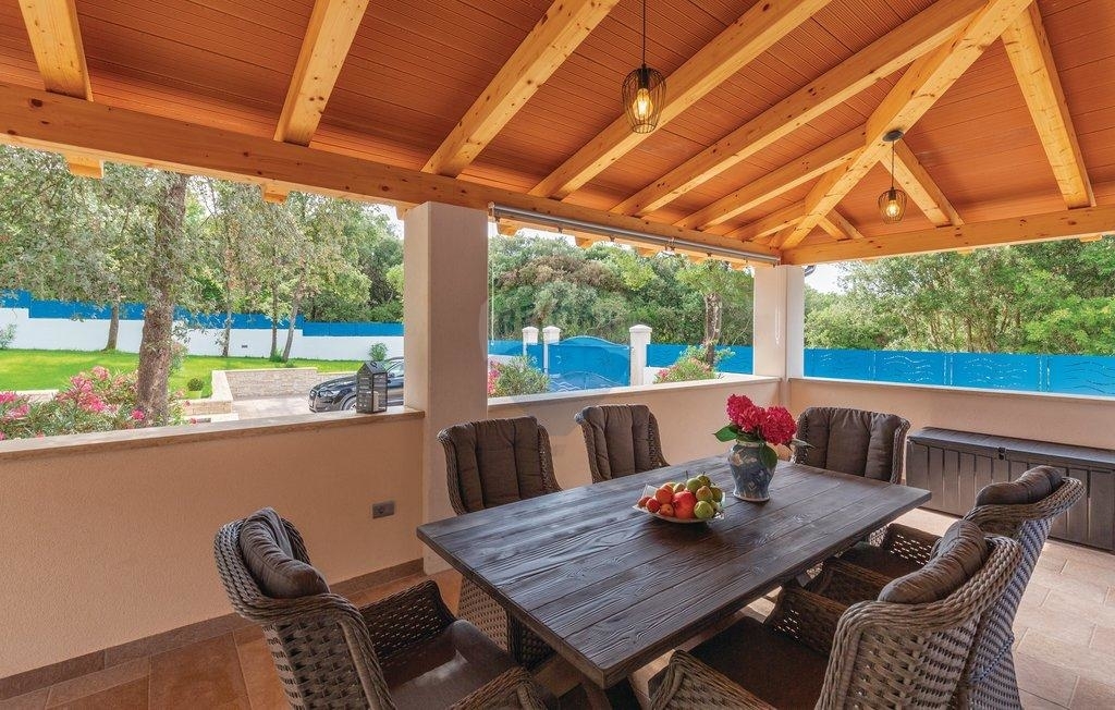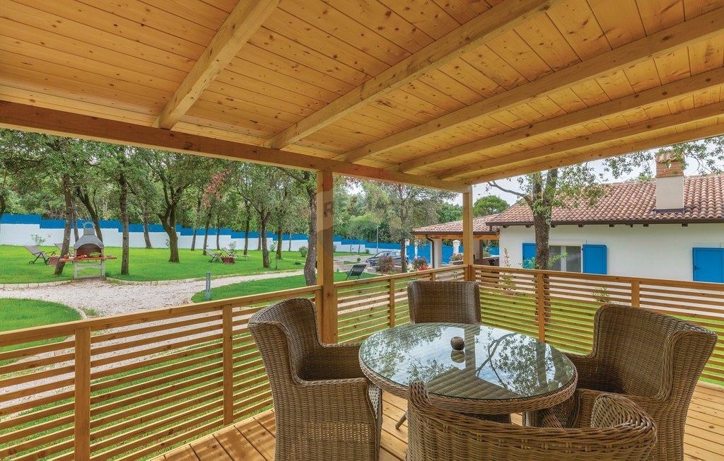 Der große Außenbereich bietet eine überdachte Terrasse, ein Nebengebäude, einen Grill, Außendusche und einen Kinderspielplatz, sowie vier Stellplätzen.