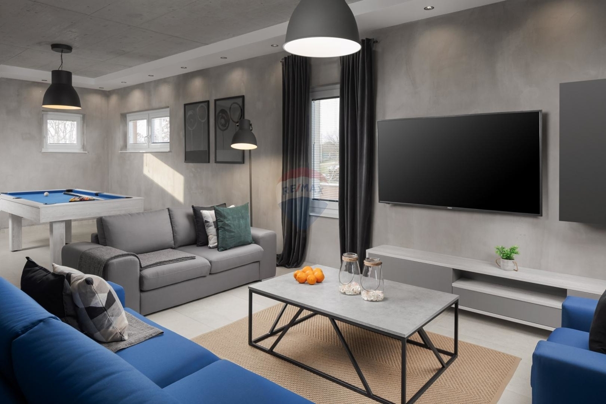 Dieses moderne Ferienhaus befindet sich im Umkreis der malerischen Stadt Vodnjan und bietet Ihnen Ruhe und Privatsphäre.Im Erdgeschoss dominiert ein großer offener Wohn-Ess-Bereich mit gemütlichem Kamin, einem Billardtisch und direktem Zugang zum Außenbereich. Die Küche bietet einen offenen Blick auf den Essbereich.