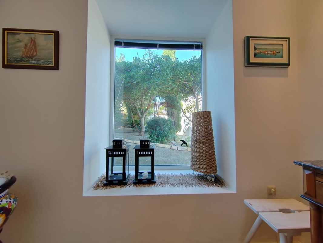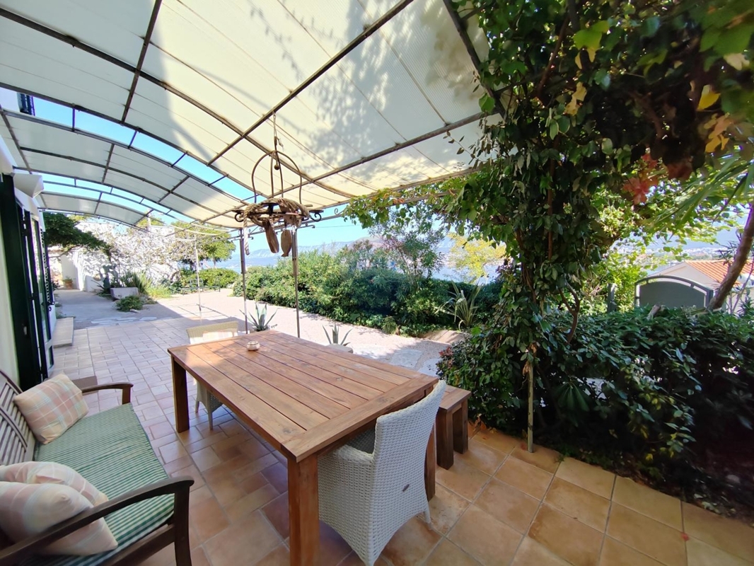Der Außenbereich ist liebevoll und zugleich pflegeleicht angelegt – mit sichtschützenden grünen Hecken und mediterranen Zierpflanzen. Auf der gemütlichen Terrasse aus haben Sie einen offenen Blick auf das Meer.