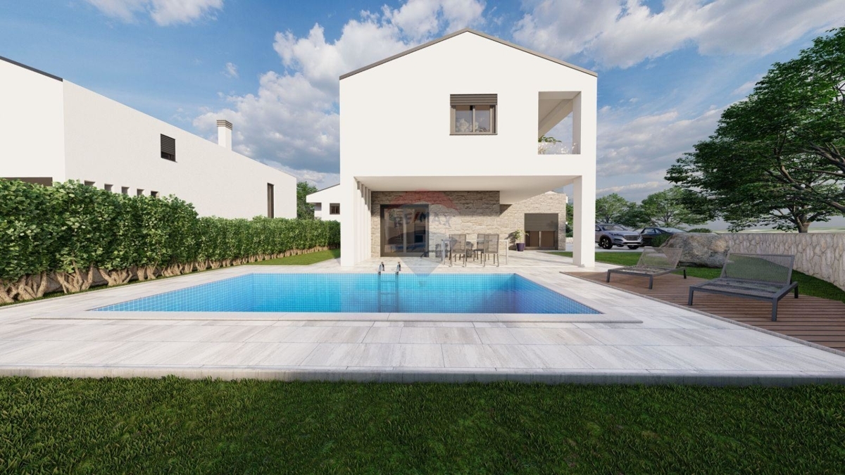 Der Außenbereich bietet eine überdachte Terrasse und einen Pool.