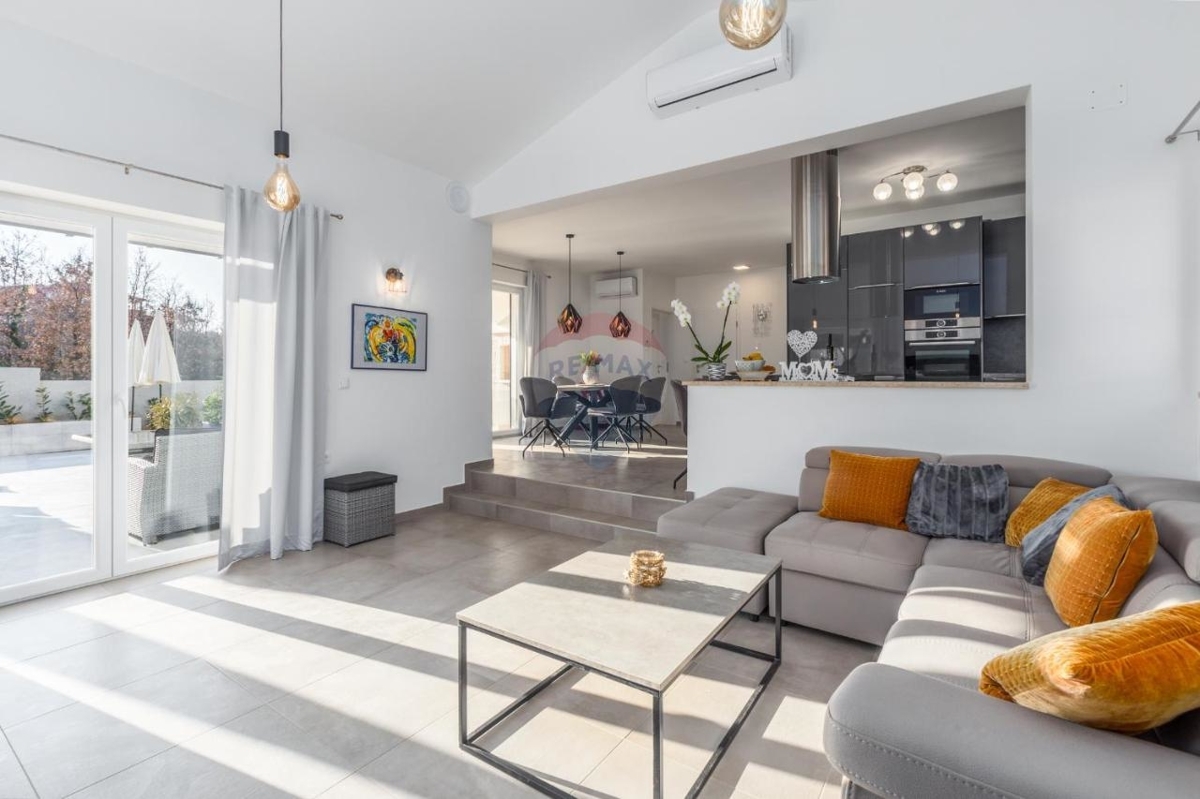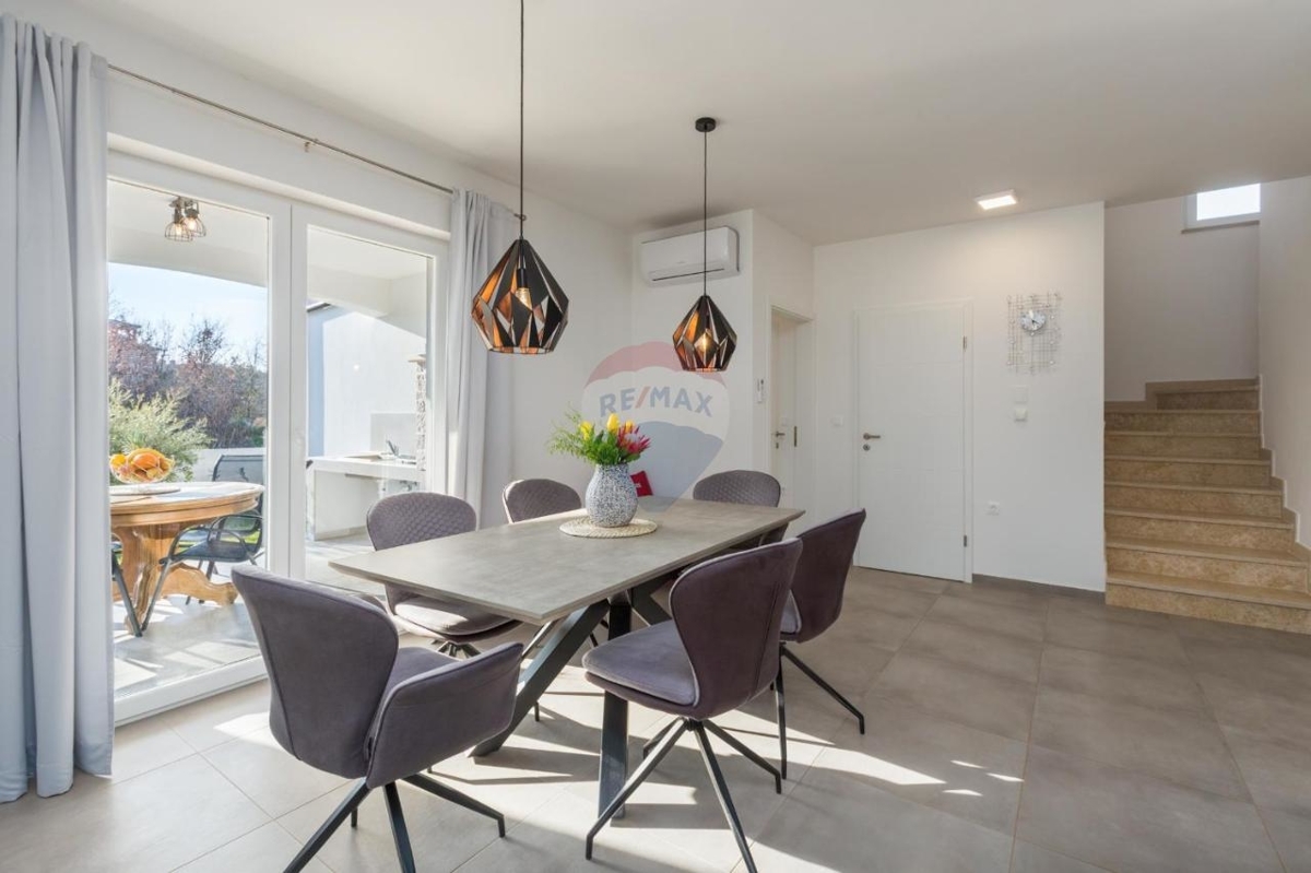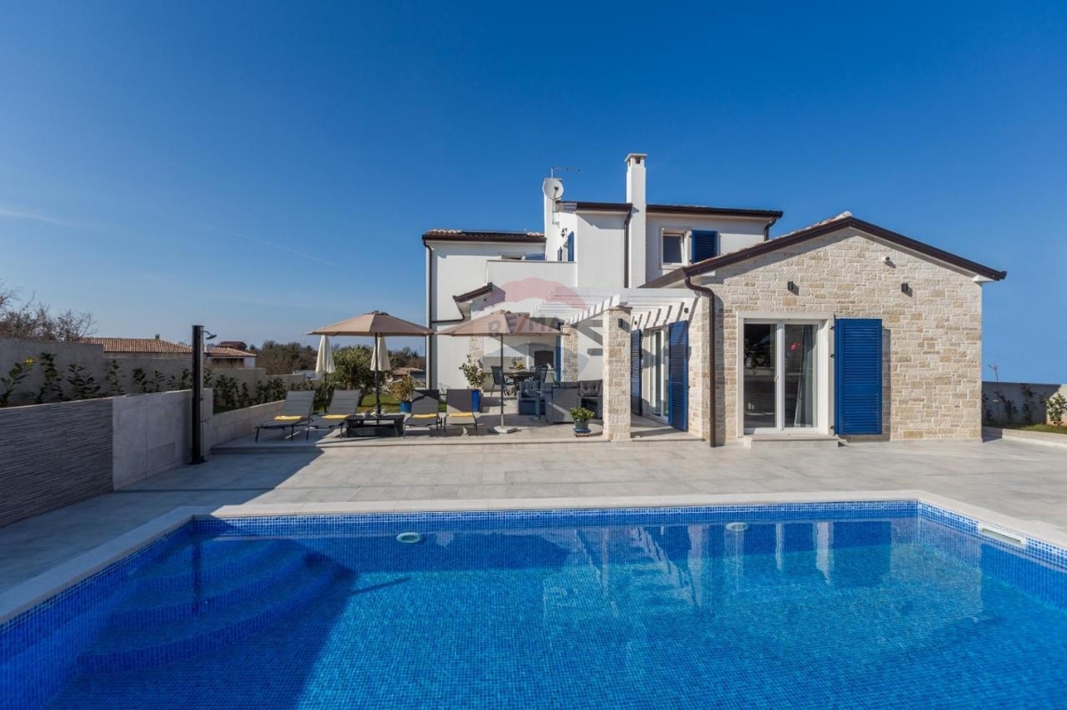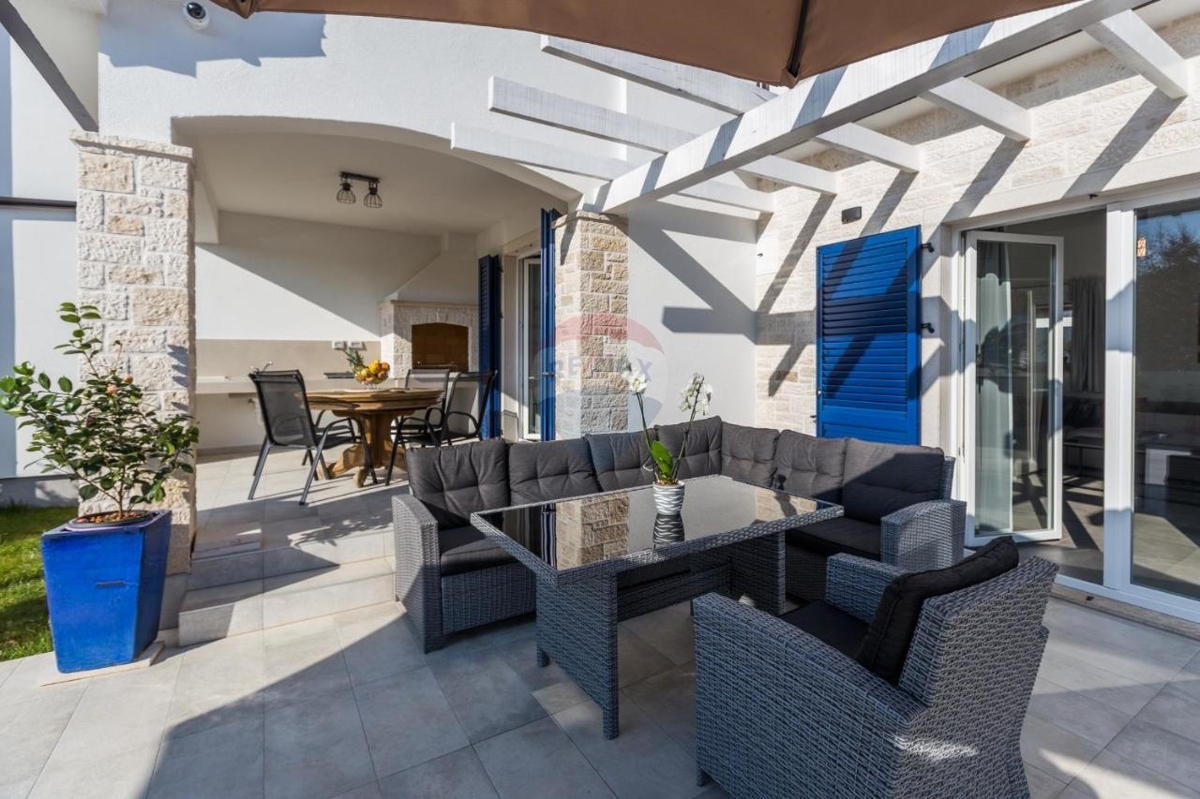 Diese schicke Villa befindet sich in der nahen Umgebung von Porec und bietet neben einer grünen Umgebung einen Rückzugsort für Ruhe und Privatsphäre in der beliebten Küstenstadt Istriens.Im Erdgeschoss befindet sich ein großer, offener Wohn-Ess-Bereich mit einer modernen, ausgestatteten Küche mit Insel. Der Wohnbereich bietet einen direkten Ausgang zur überdachten Terrasse. Desweiteren verfügt das Stockwerk über ein Schlafzimmer mit eigenem Badezimmer sowie ein separates Gäste-WC.