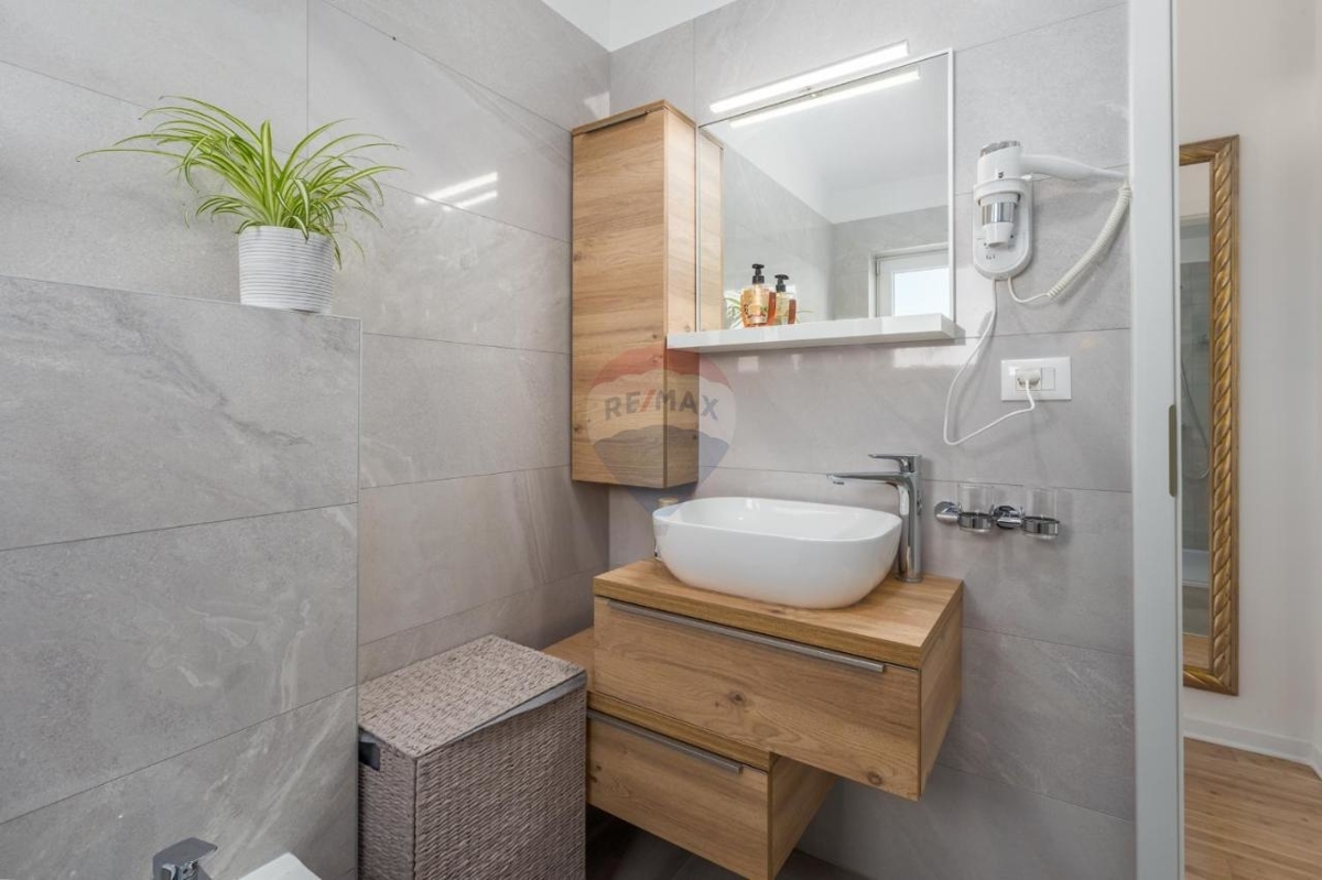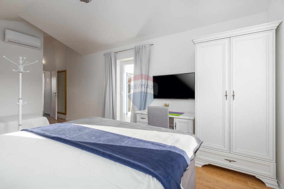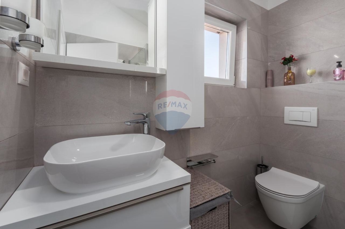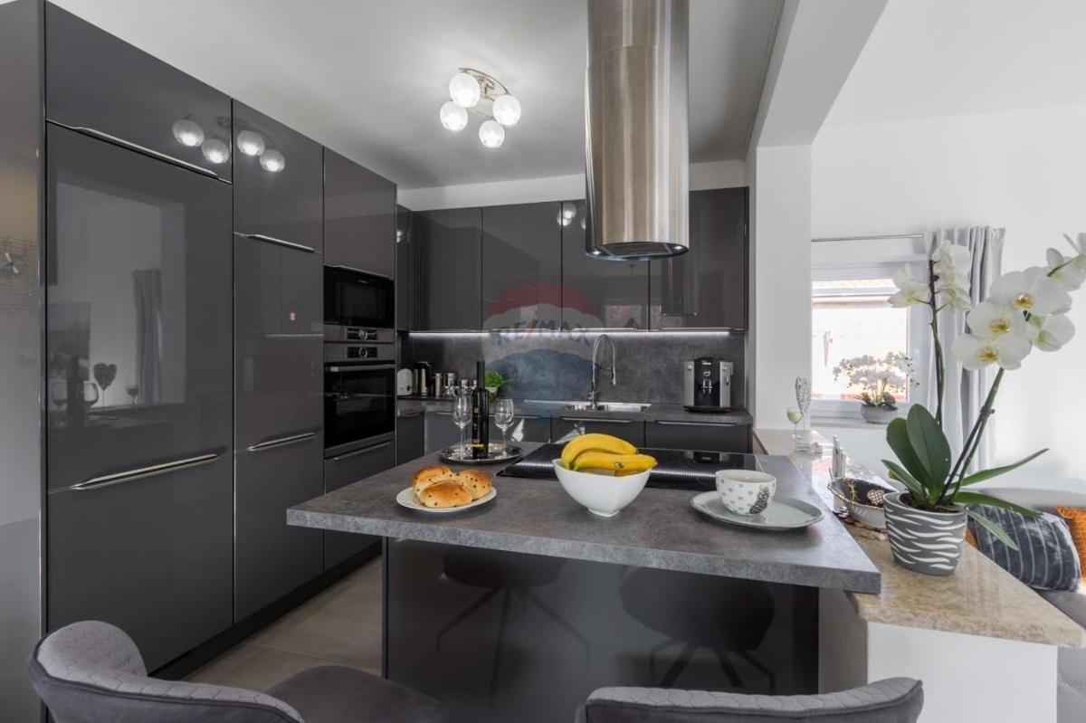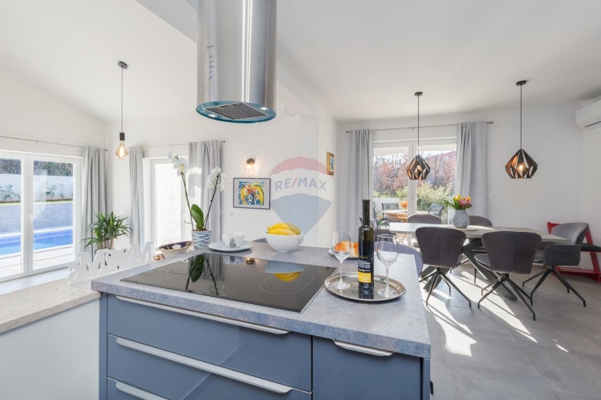 Diese schicke Villa befindet sich in der nahen Umgebung von Porec und bietet neben einer grünen Umgebung einen Rückzugsort für Ruhe und Privatsphäre in der beliebten Küstenstadt Istriens.Im Erdgeschoss befindet sich ein großer, offener Wohn-Ess-Bereich mit einer modernen, ausgestatteten Küche mit Insel. Der Wohnbereich bietet einen direkten Ausgang zur überdachten Terrasse. Desweiteren verfügt das Stockwerk über ein Schlafzimmer mit eigenem Badezimmer sowie ein separates Gäste-WC.