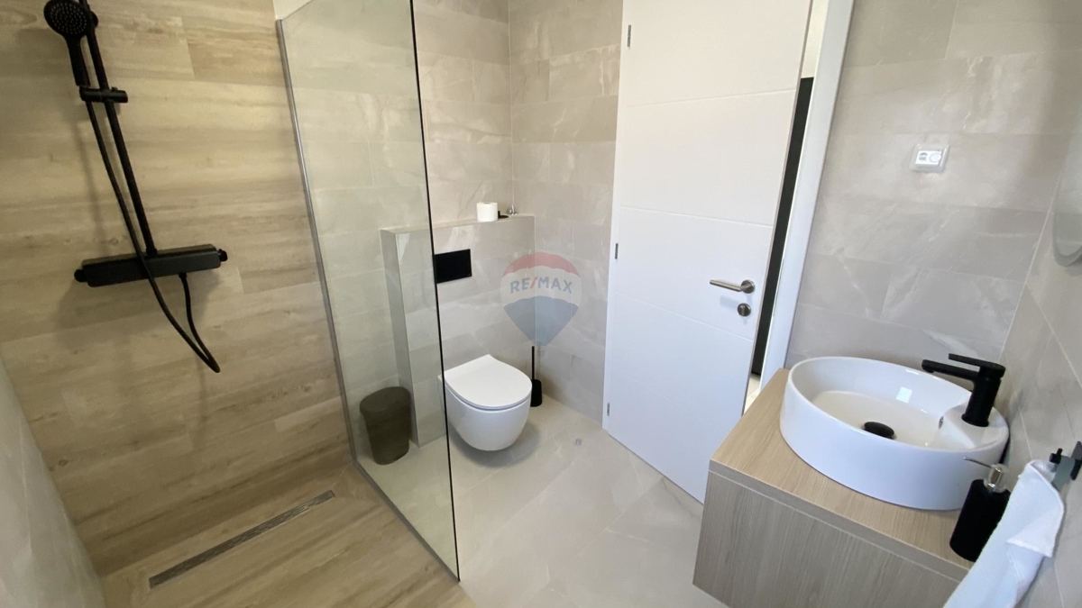 Im Erdgeschoss dominiert der offene Wohn-Ess-Bereich mit Küche und direktem Zugang zum Außenbereich. Ein Schlafzimmer mit eigenem Badezimmer, ein Gäste-WC, ein Abstellraum sowie eine Waschküche runden das Geschoss ab.