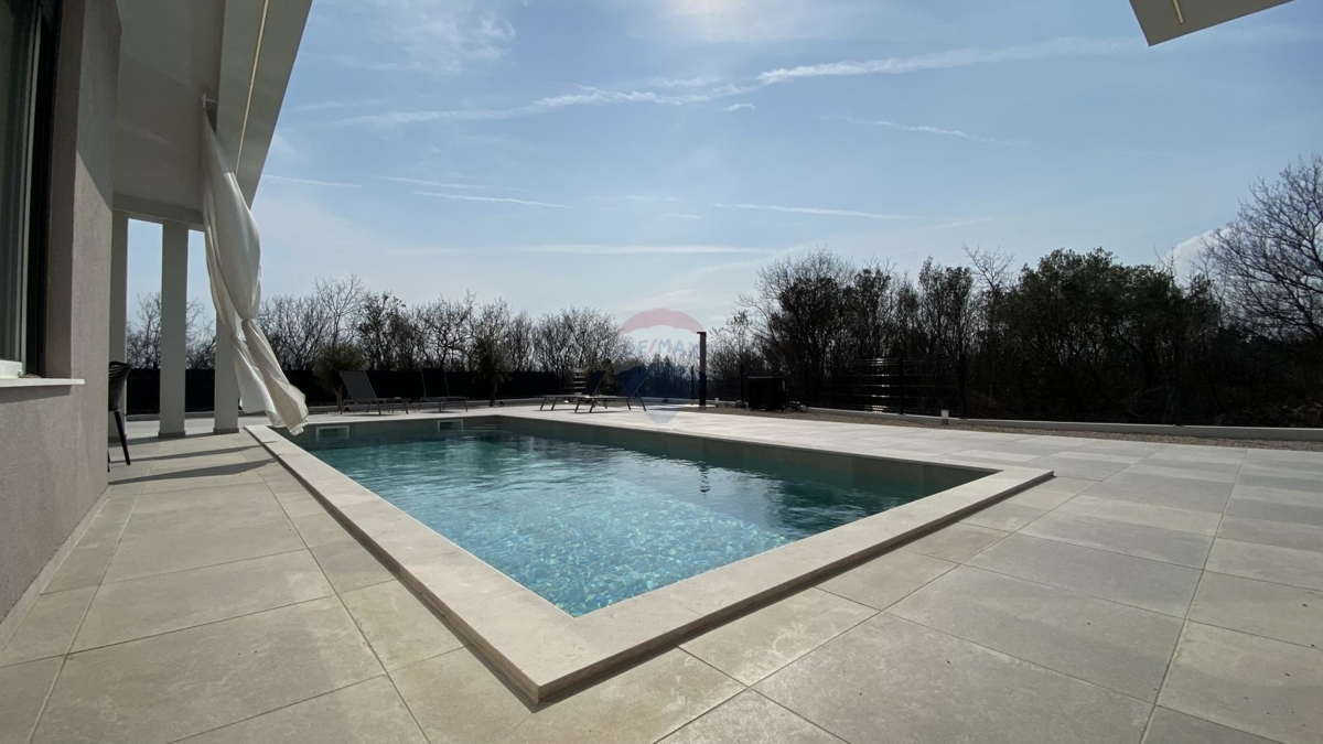 Moderne Neubauvilla mit Pool umgeben von Grün