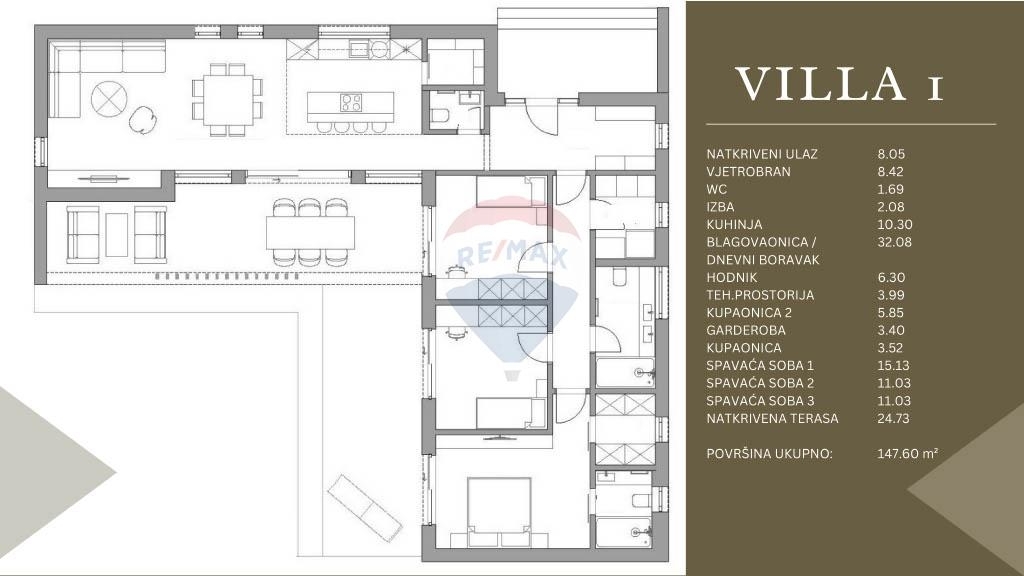 Das ganze Haus ist mit perfekter Technik ausgestattet. Es wurde von dem renommierten kroatischen Hersteller von Niedrigenergie-Fertighäusern Domus plus gebaut.Heizen/Kühlen und Warmwasser erfolgt mittels Wärmepumpe (Viessmann), es wird eine Fußbodenheizung im gesamten Haus verlegt. Darüber hinaus werden alle Zimmer klimatisiert (Mitsubishi) und mit einem TV ausgestattet.