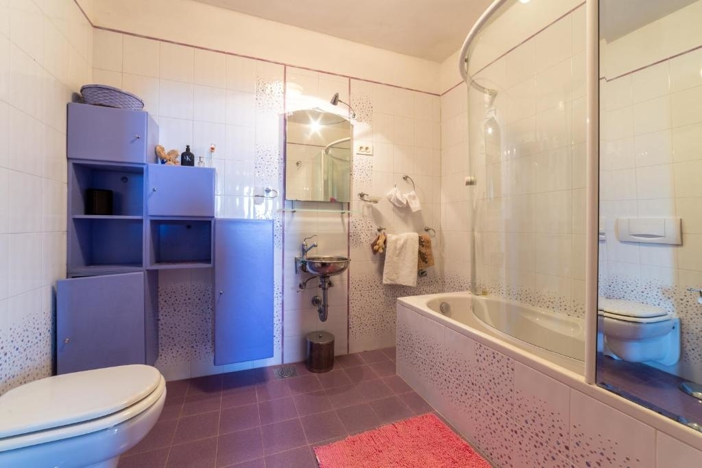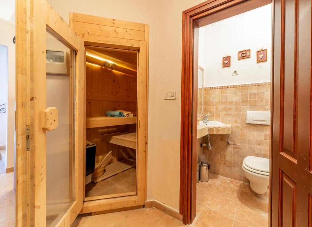 Weiter auf dieser Etage befindet sich ein Schlafzimmer mit Bad sowie der Wellnessraum mit Sauna und einem Bad.