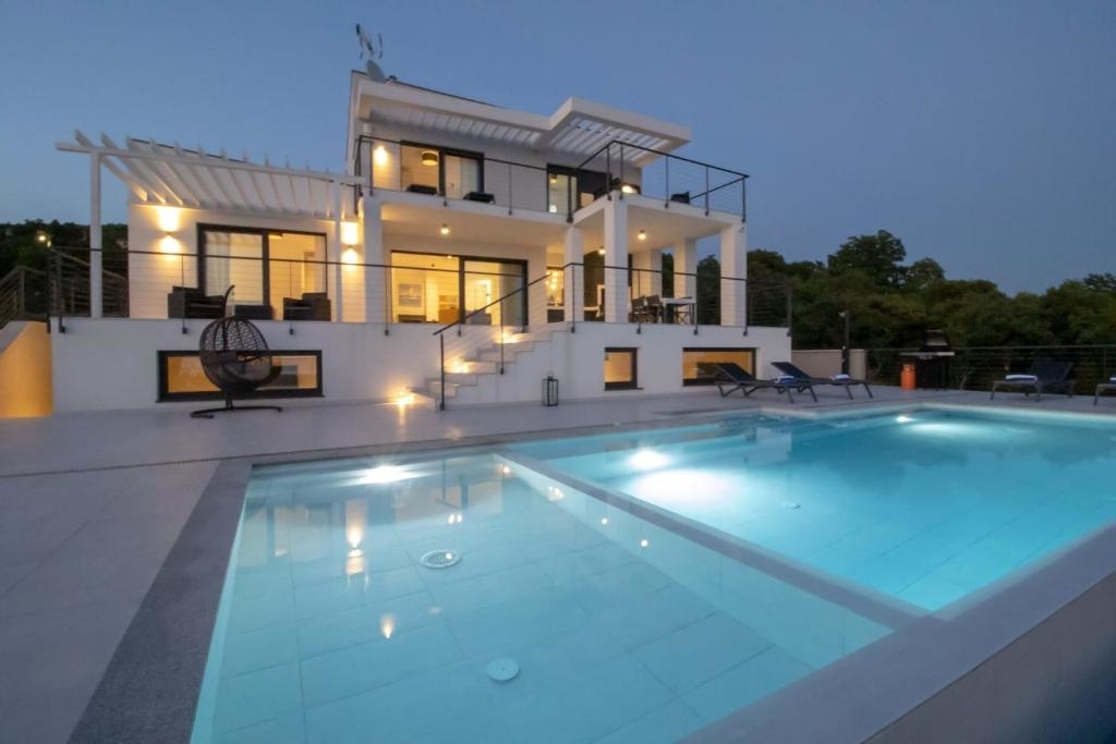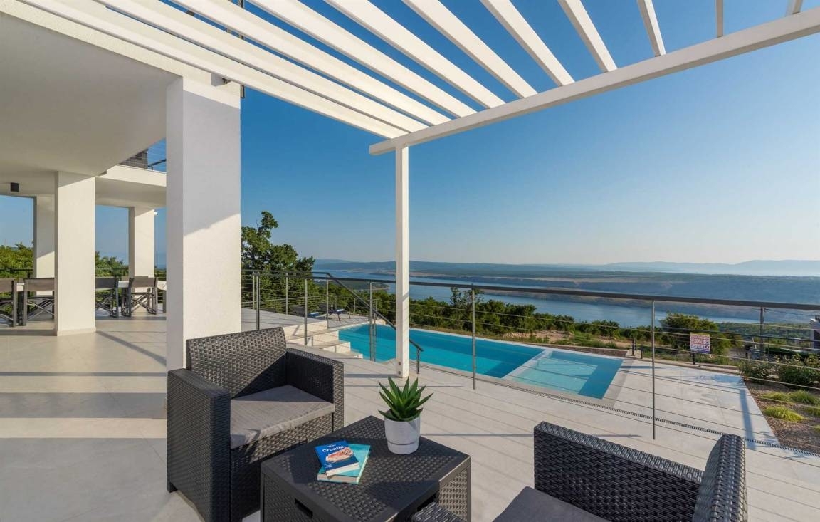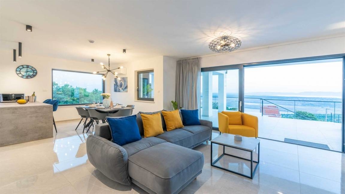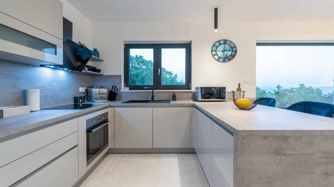 Dieses moderne Neubau befindet sich in Jadranovo. Die erhöhte Lage ermöglicht Ihnen einen offenen Panoramablick auf das Meer und die Insel Krk. Die Randlage garantiert Ihnen Ruhe und Privatsphäre und zugleich sind Sie schnell am Meer und mittendrin.Im Souterrain des Hauses befindet sich ein Gaming- und Fitnessraum sowie ein Wellnessbereich mit Sauna und Jaccuzzi mit WC, einem Abstellraum und dem Heizungskeller.