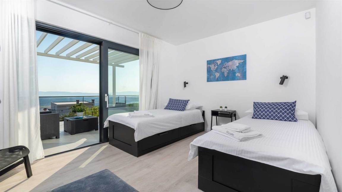 Im Obergeschoss befinden sich zwei weitere Schlafzimmer mit eigenem Badezimmer sowie einem Ausgang auf den großen Balkon mit herrlichem offenen Blick aufs Meer und die Insel Krk.