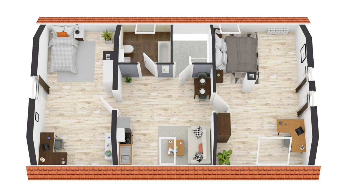 Diese umfasst Schlaf- und Wohnzimmer sowie eine Küche. Das Badezimmer ist mit einer Badewanne ausgestattet, ein nebenanliegendes WC rundet die Etage ab.