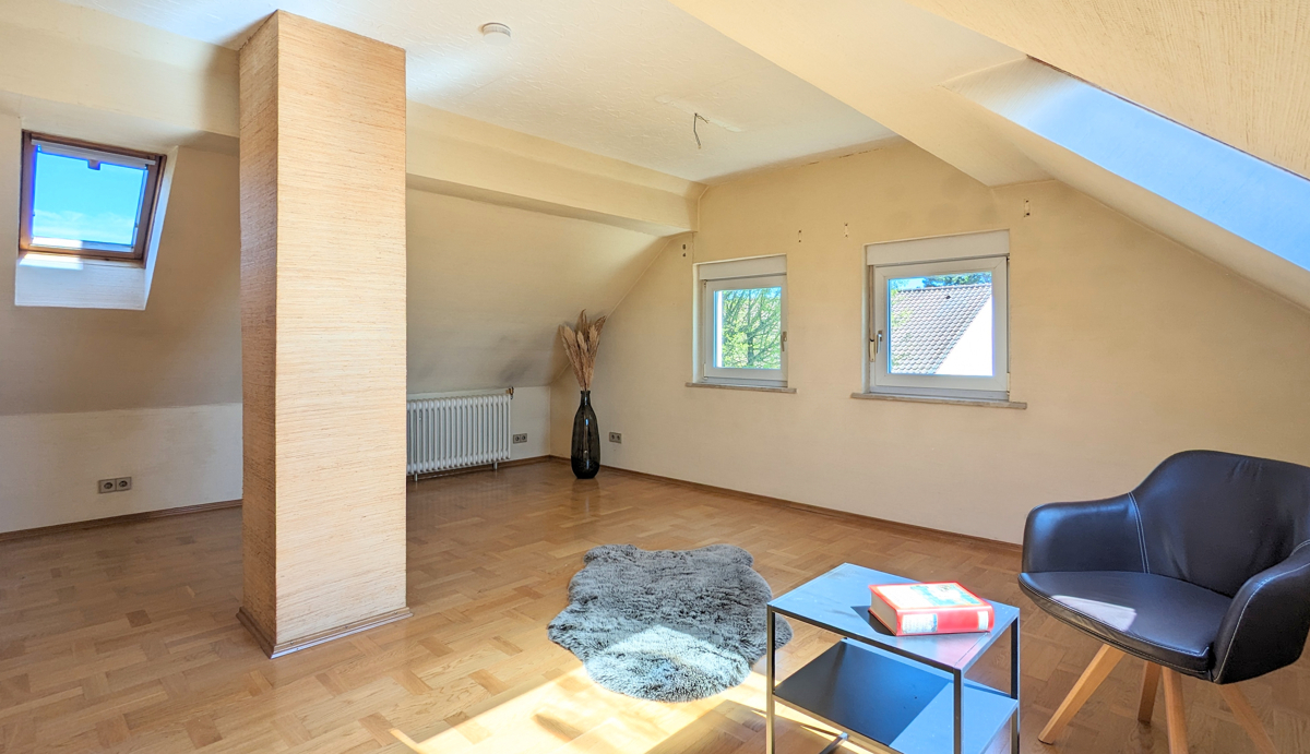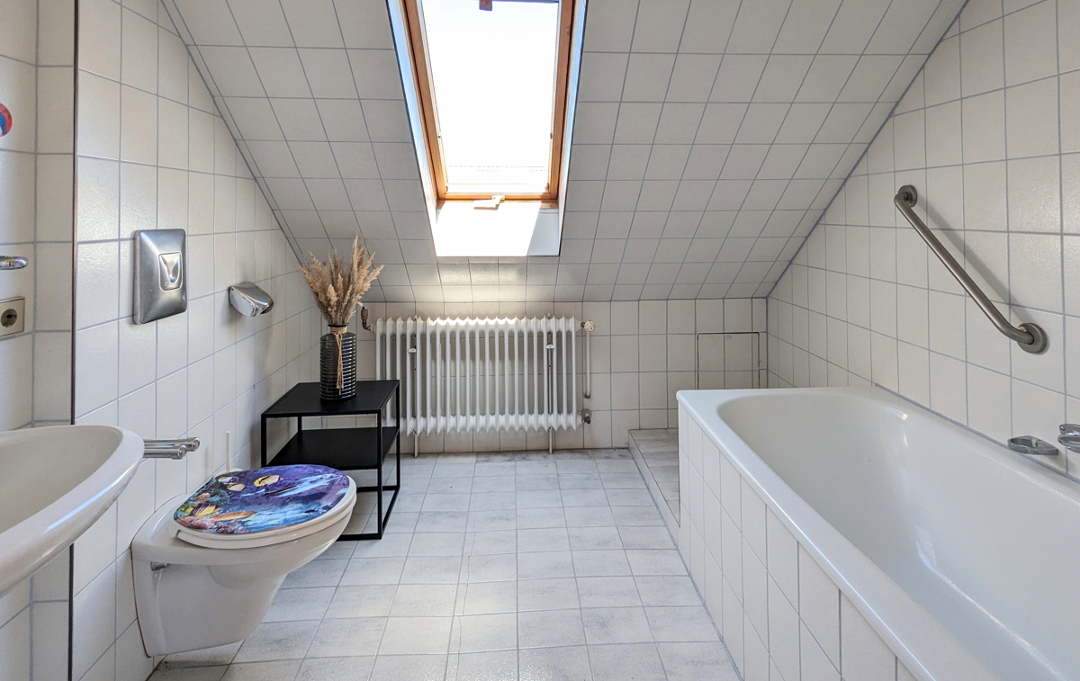 Über das Obergeschoss erreicht man letztlich auch das ausgebaute Dachgeschoss. Durch einen Durchgangsflur erreicht man zwei größere Zimmer sowie ein Badezimmer mit Badewanne. Hier wurde der im Grundriss westlich liegende Raum mangels Heizkörper nicht zur Wohnfläche mit ca. 35 m² eingerechnet.