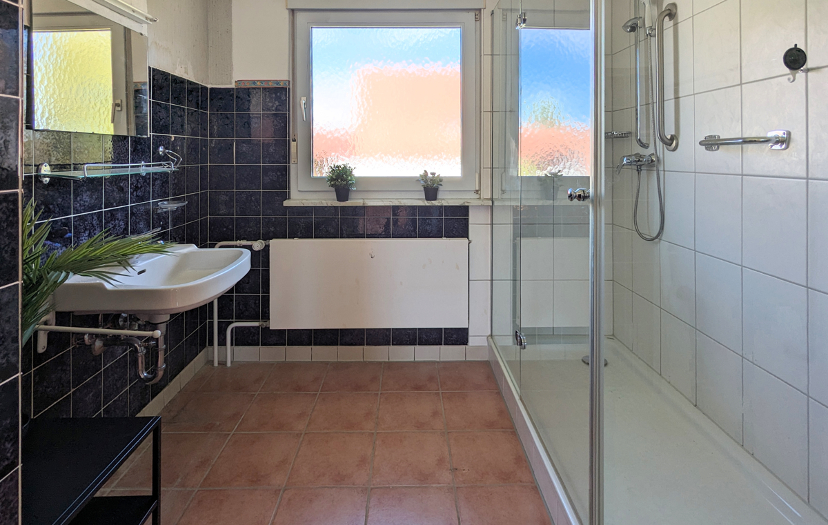 Das Obergeschoss gestaltet sich zunächst deckungsgleich dem Erdgeschoss. Allerdings erweitert sich die Wohnfläche hier noch um zwei weitere Räume und einen Zugang zum Balkon, sodass hier eine Wohnfläche von ca. 82 m² zur Verfügung steht. Das hiesige Badezimmer erfuhr 2009 eine Umgestaltung, sodass hier eine barrierearme Duschkabine die ehemalige Badewanne ersetzt hat.