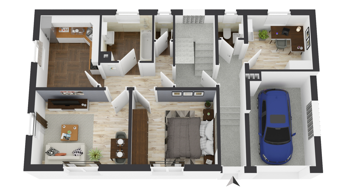 Der Grundriss des Erdgeschosses weißt mit der ins Haus integrierten, geräumigen Einzelgarage bereits die erste Besonderheit auf. In der Garage finden auch größere Pkw problemlos Platz. Durch den Hauseingang kommend erreichen Sie zunächst ein separat betretbares Zimmer mit eigenem WC.