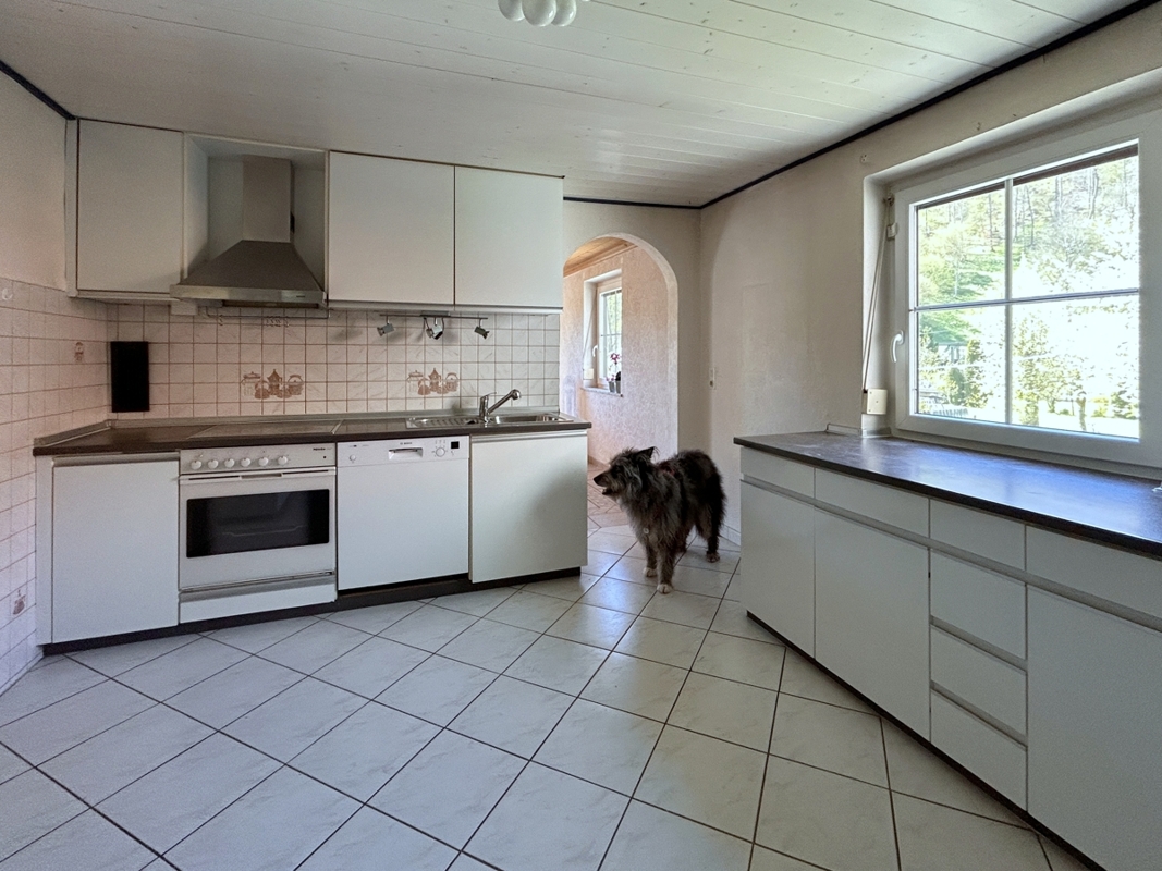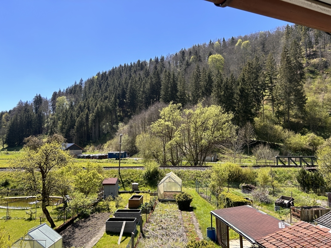 in Hütten, dem romantischen Dorf im Schmiechtal, am Ende einer Sackgasse. Das Grundstück erstreckt sich südlich vom Haus bis zur (kaum befahrenen) Bahnlinie.Ausstattung: