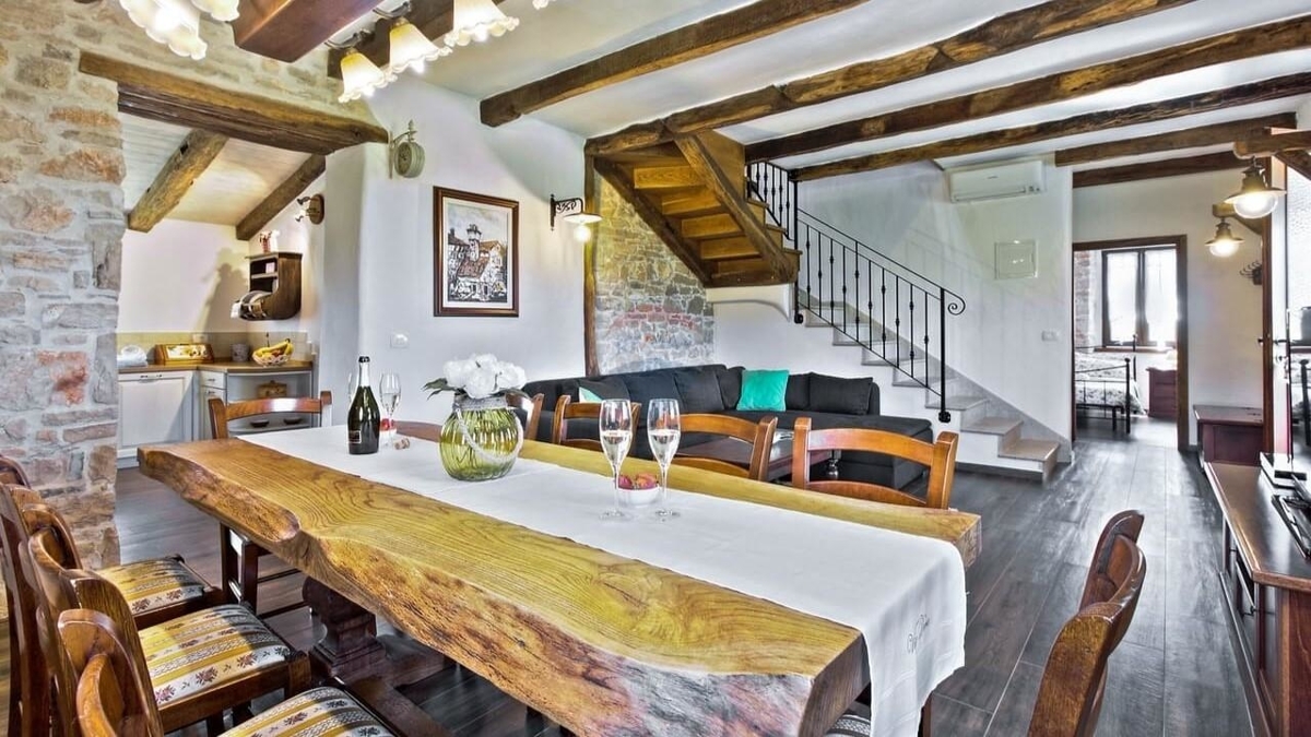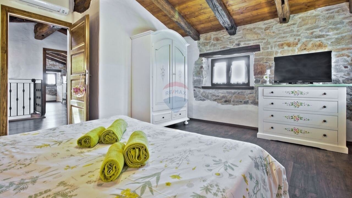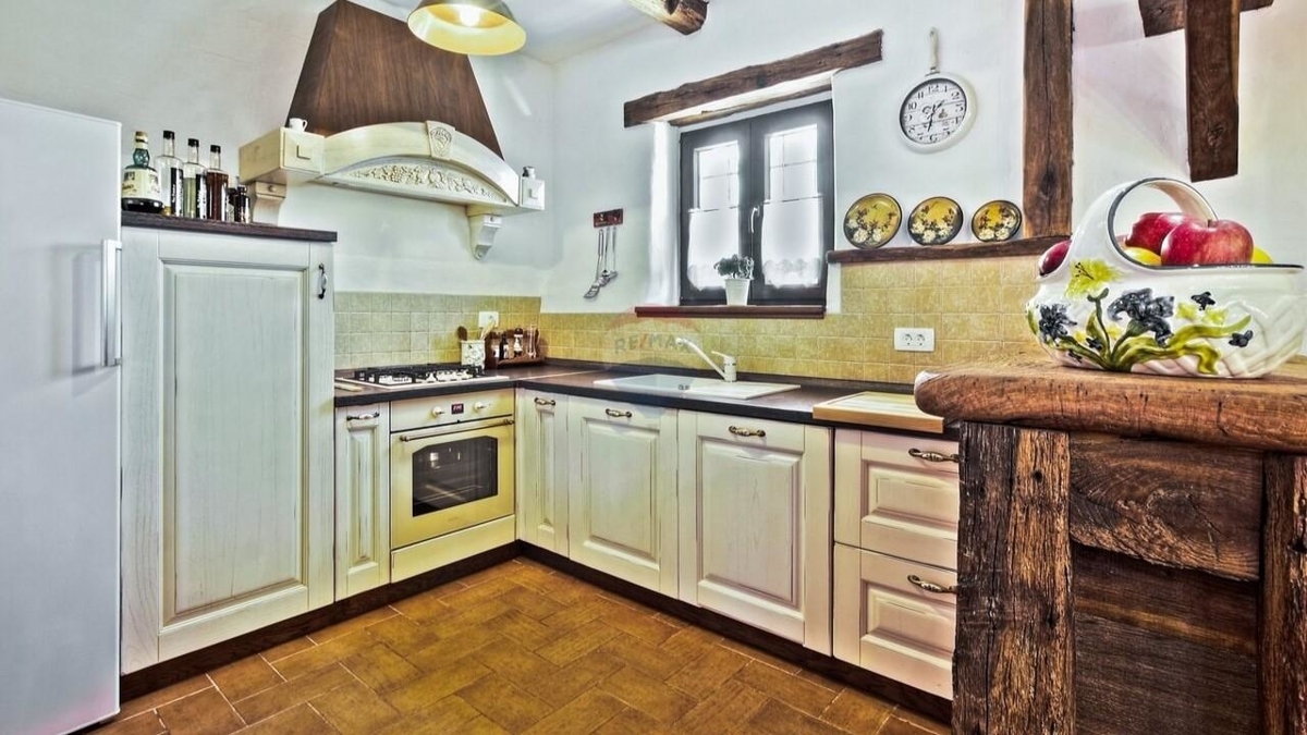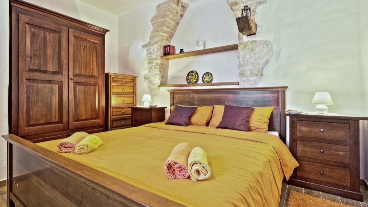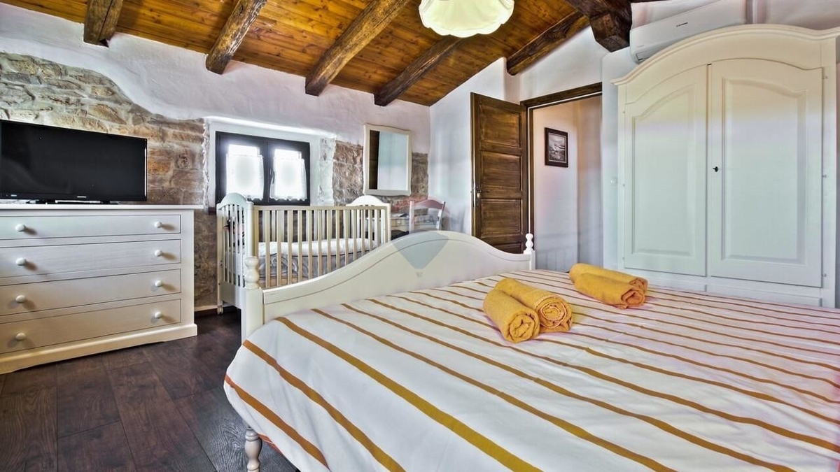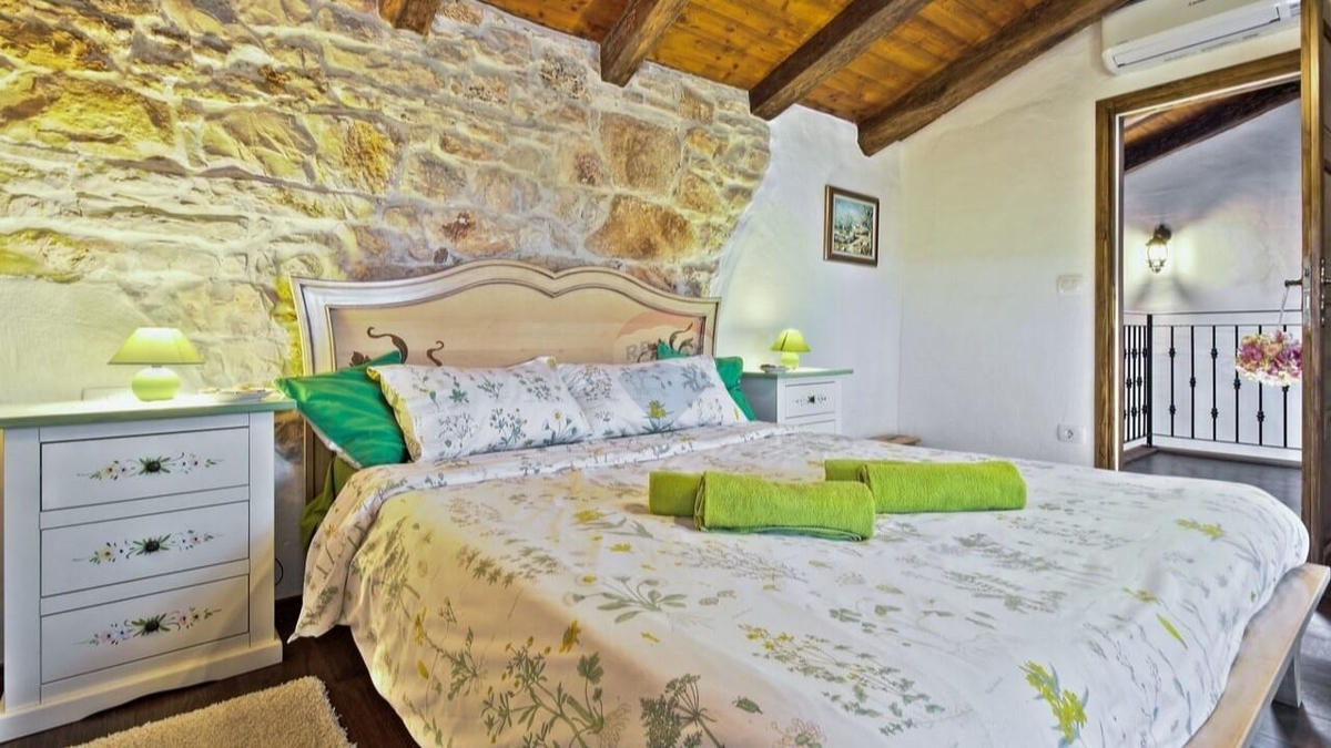 Im Erdgeschoss befindet sich die typische „Konoba“ – eine urige „Stube“ bestehend aus Wohnküche mit Kamin sowie ein Schlafzimmer mit Bad.
