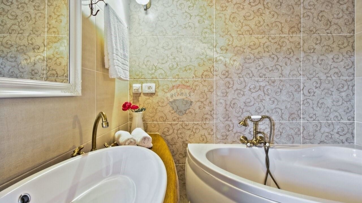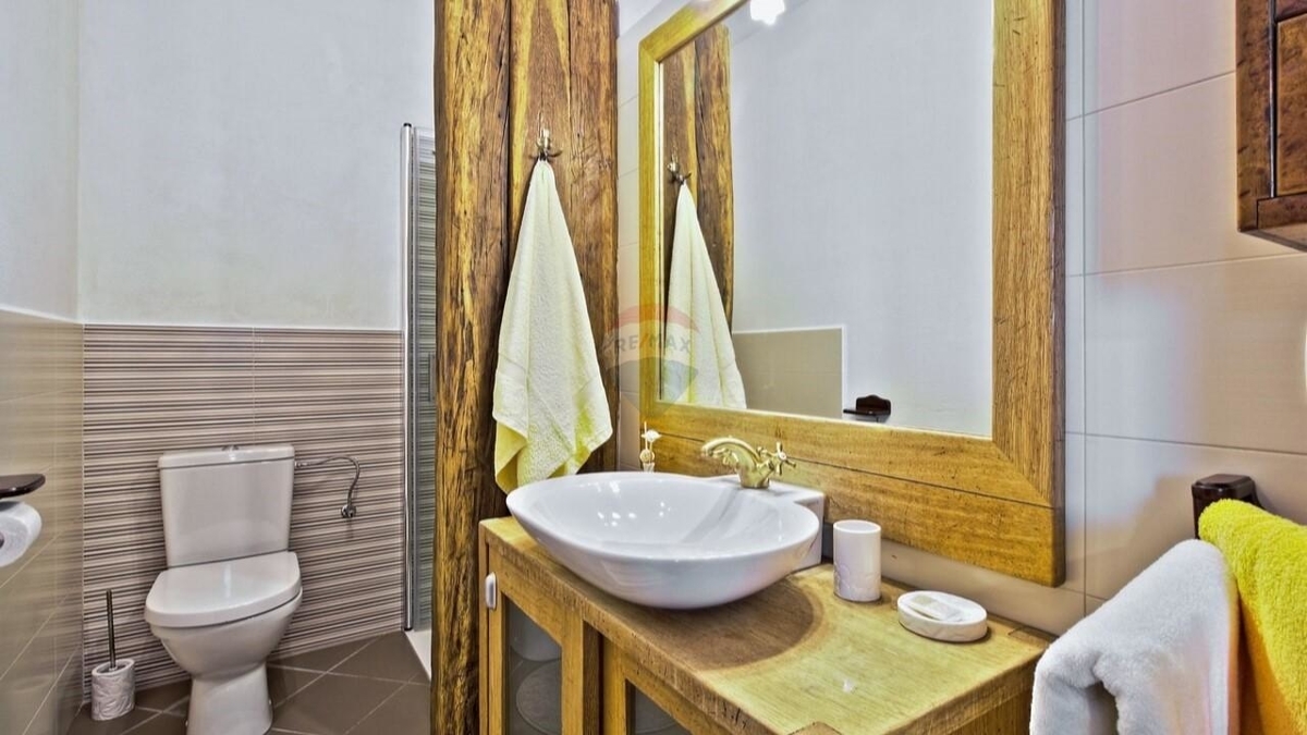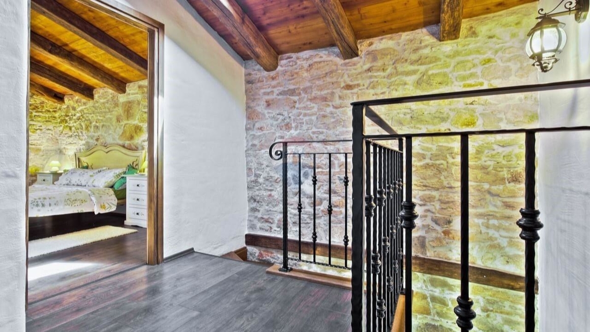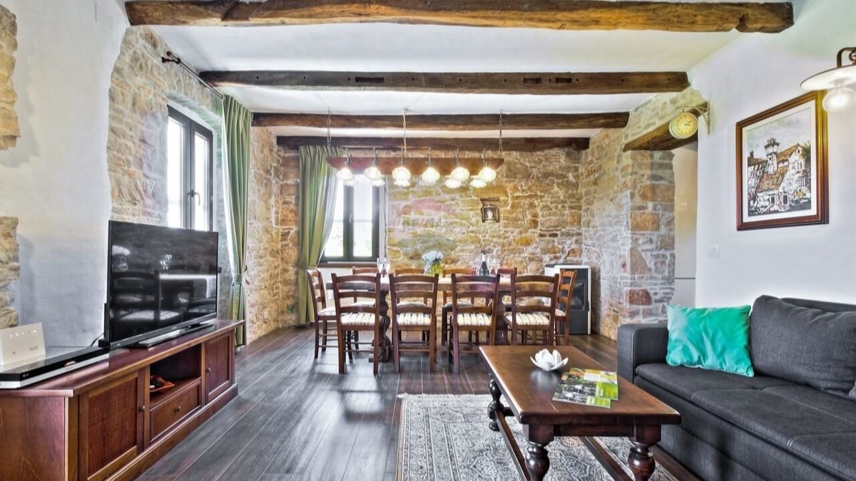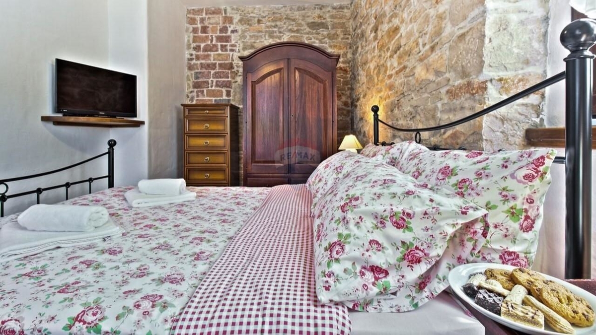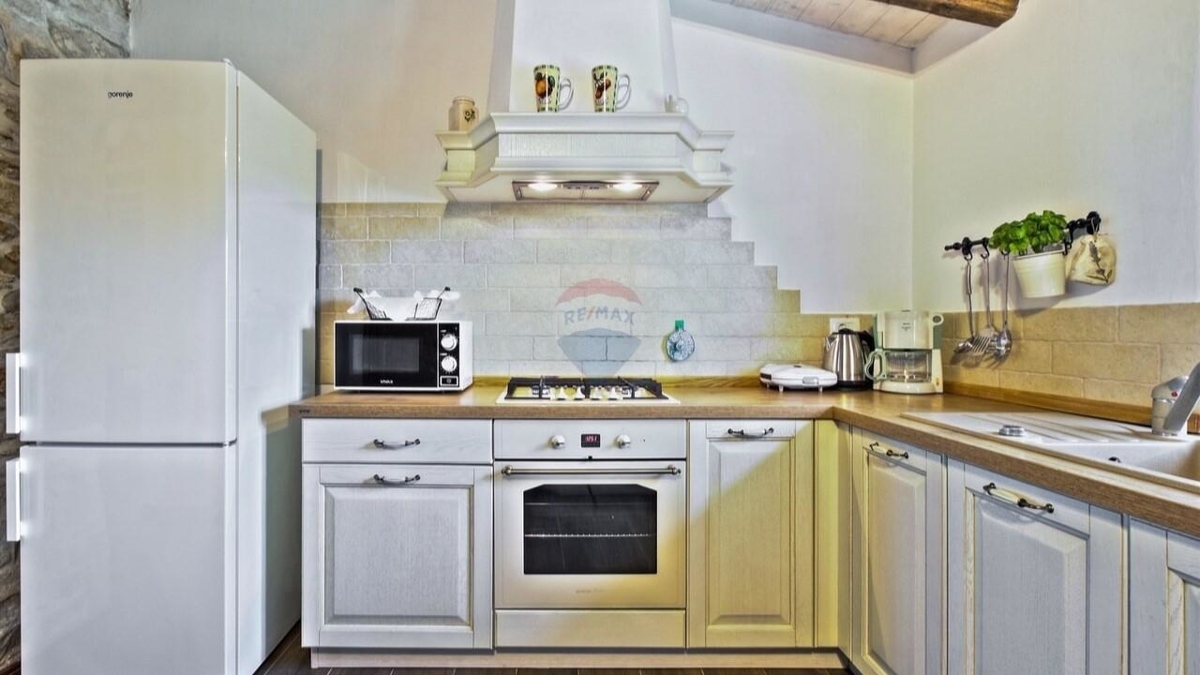 Im Erdgeschoss befindet sich die typische „Konoba“ – eine urige „Stube“ bestehend aus Wohnküche mit Kamin sowie ein Schlafzimmer mit Bad.