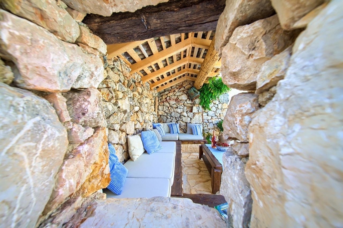 Die Außenanlage ist äußerst gemütlich angelegt – um den großen Pool ist kleiner Strand angelegt, im Baumschatten lockt der urige Steintisch um sich zu gesellen, es gibt einen Grillplatz und eine Boccia-Bahn. Überall sind mediterrane, aromatische Pflanzen angelegt.