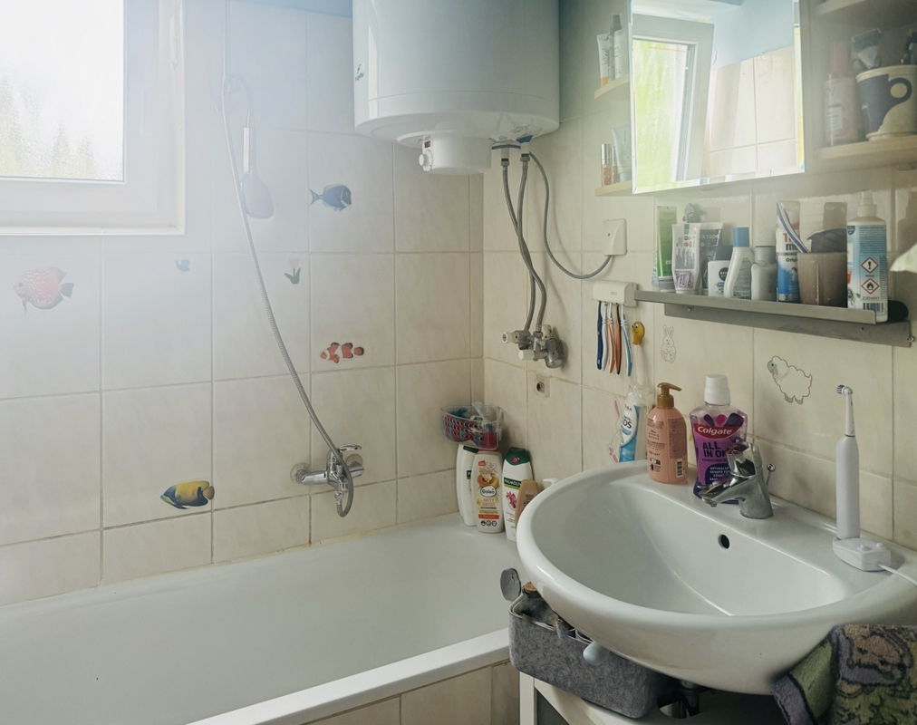 Das Bad ist ausgestattet mit Badewanne, Waschbecken, Toilette.