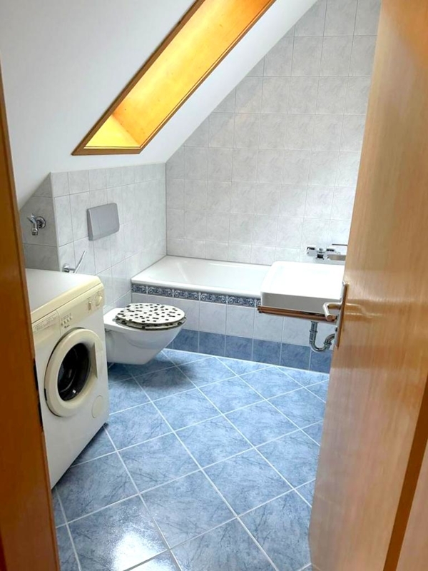 Schlaf- und Umkleidezimmer im DG. Das Bad ist mit Wanne, Waschbecken, WC und Waschmaschinenanschluss ausgestattet.