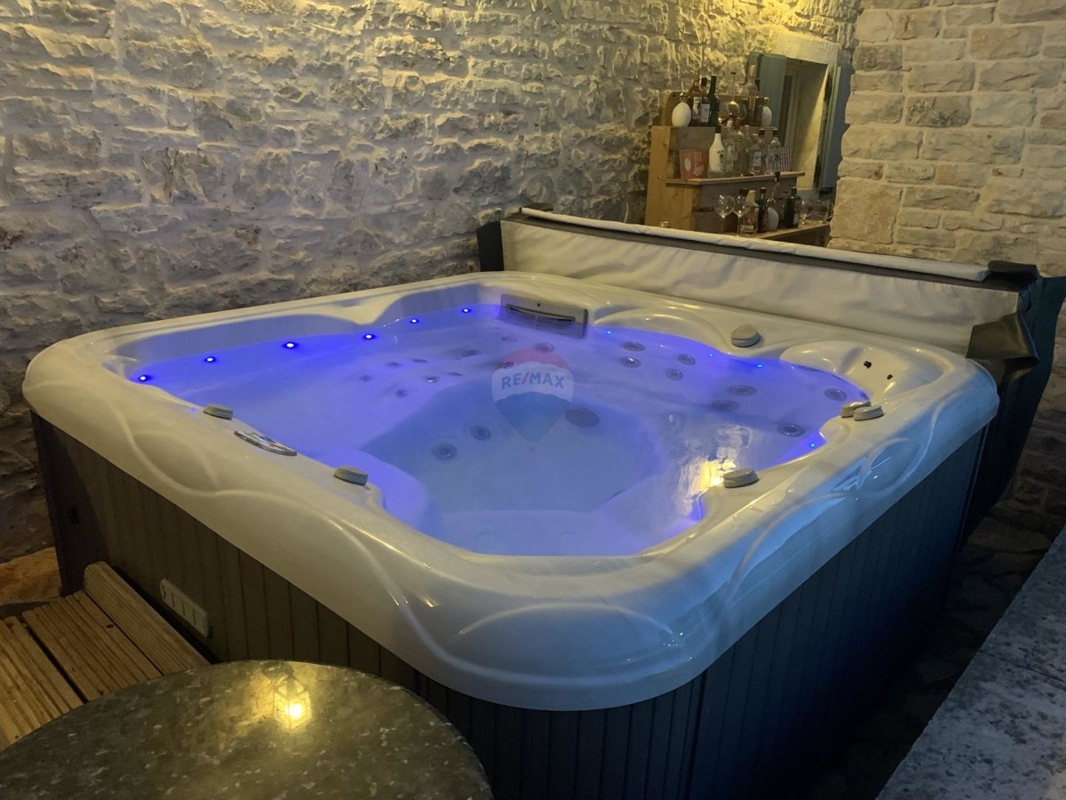 Im Garten befindet sich das Nebengebäude – eine überdachte Sommerküche mit Kamin-Grill und einem Nebenraum. Davor liegt der Pool und die Sonnenterrasse, sowie ein Whirlpool.
