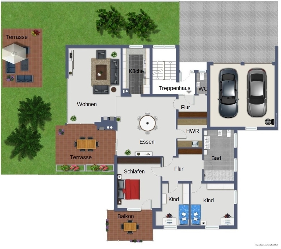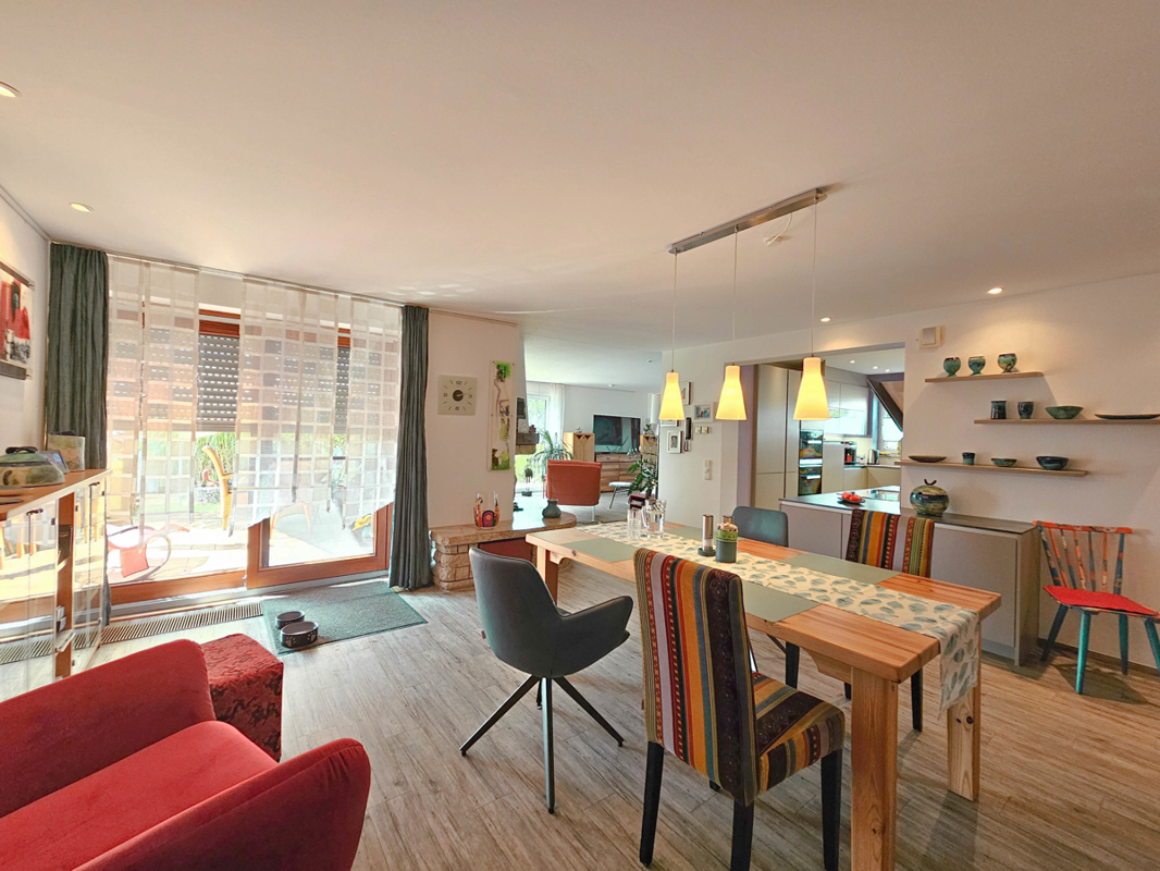 • Erdgeschoss: 5,5-Zimmer-Wohnung, ca. 143 m² Wohnfläche. Die Wohnung umfasst einen Flur mit Garderobe, Gäste-WC, einen großen offenen Wohnbereich mit Esszimmer, Wohnzimmer, Küche und Zugang zu zwei Terrassen, Elternschlafzimmer mit eigenem Balkon, zwei Kinderzimmer sowie ein Badezimmer mit barrierefreier Dusche und WC. Ein Hauswirtschaftsraum mit Anschlüssen für Waschmaschine und Trockner ergänzt das Angebot.