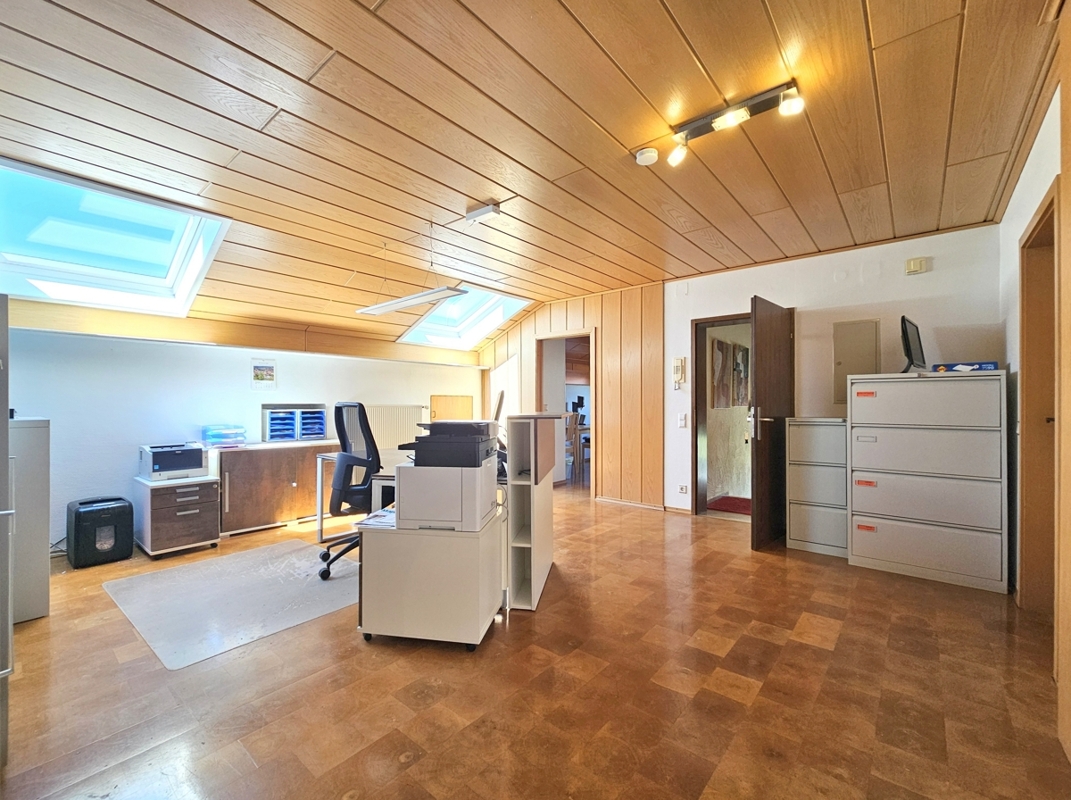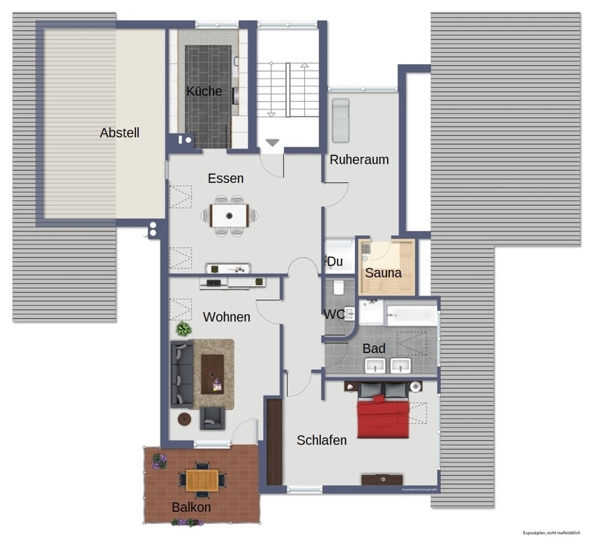 • Dachgeschoss: 3,5-Zimmer-Wohnung, ca. 107 m² Wohnfläche. Die Wohnung teilt sich auf in eine Küche, Esszimmer, Wohnzimmer, Kinderzimmer, Badezimmer, separates WC sowie eine Sauna mit Dusche und Ruheraum.