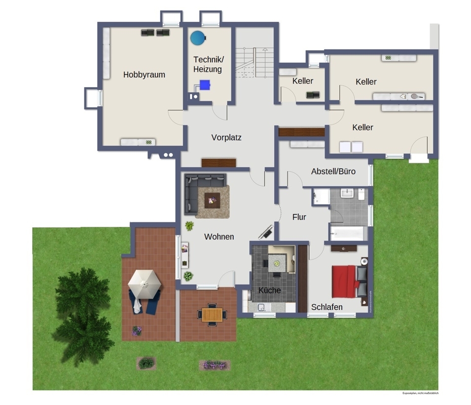 • Untergeschoss/Gartengeschoss: 3-Zimmer-Wohnung, ca. 76 m² Wohnfläche. Diese Wohneinheit besteht aus einem Wohnzimmer, einer Küche, einem Schlafzimmer, einem Badezimmer mit WC sowie einem Abstellraum, der auch als Büro genutzt werden kann.
