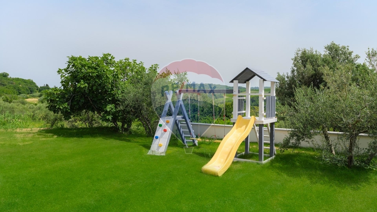 Im Außenbereich haben Sie eine große, teilweise überdachte Terrassenfläche mit 32 m² großem Pool und einer überdachten Sommerküche. Über einer Treppe gelangen Sie in den großen Garten mit Kinderspielplatz.