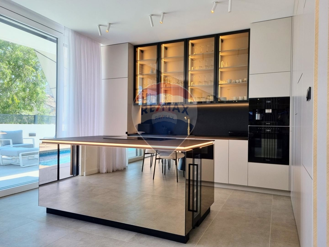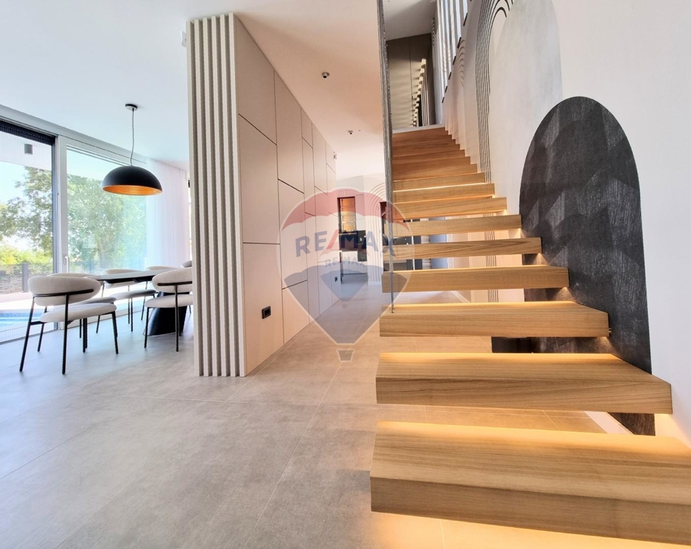 Ausgestattet ist die Villa unter anderem mit hochwertigen, 3-Fach-PVC-Türen und Fenstern mit IZO-Glas, Fußbodenheizung mittels Wärmepumpe, Videoüberwachung und Alarmanlage.Die Treppe aus Stahl ist mit Massivholz verkleidet und hat eine automatische Beleuchtung. Der Salzwasser-Pool ist beheizt, 10x3 m groß, mit Glaskeramik-Fliesen und Elektrolyse.