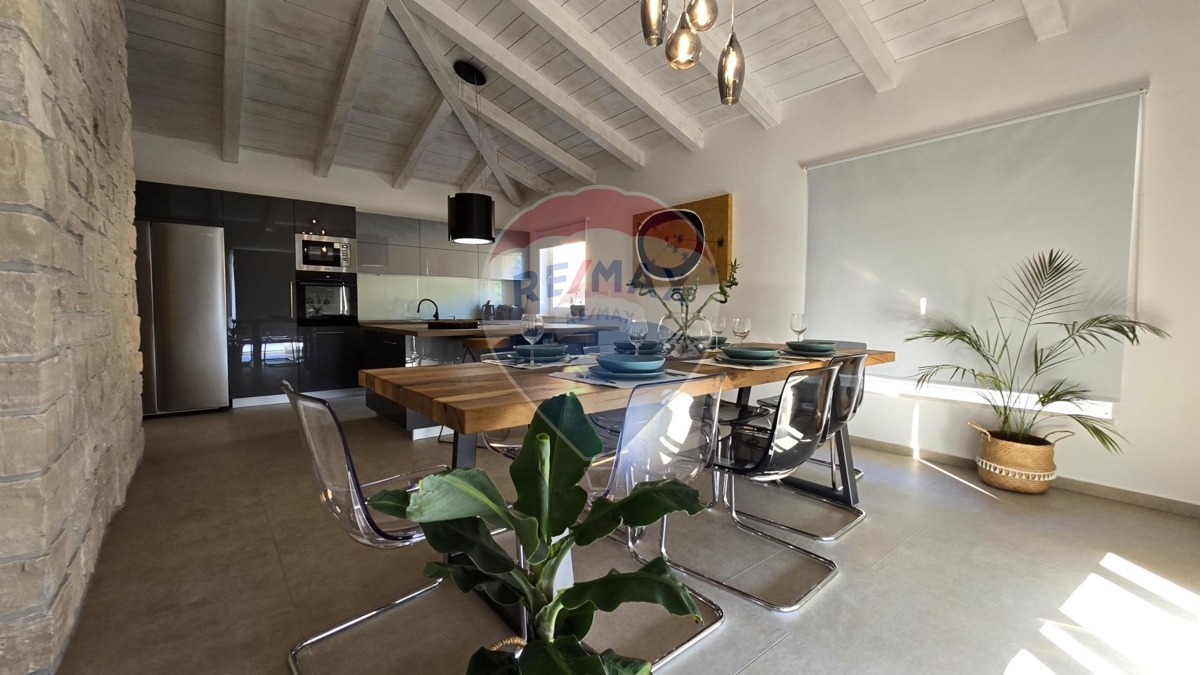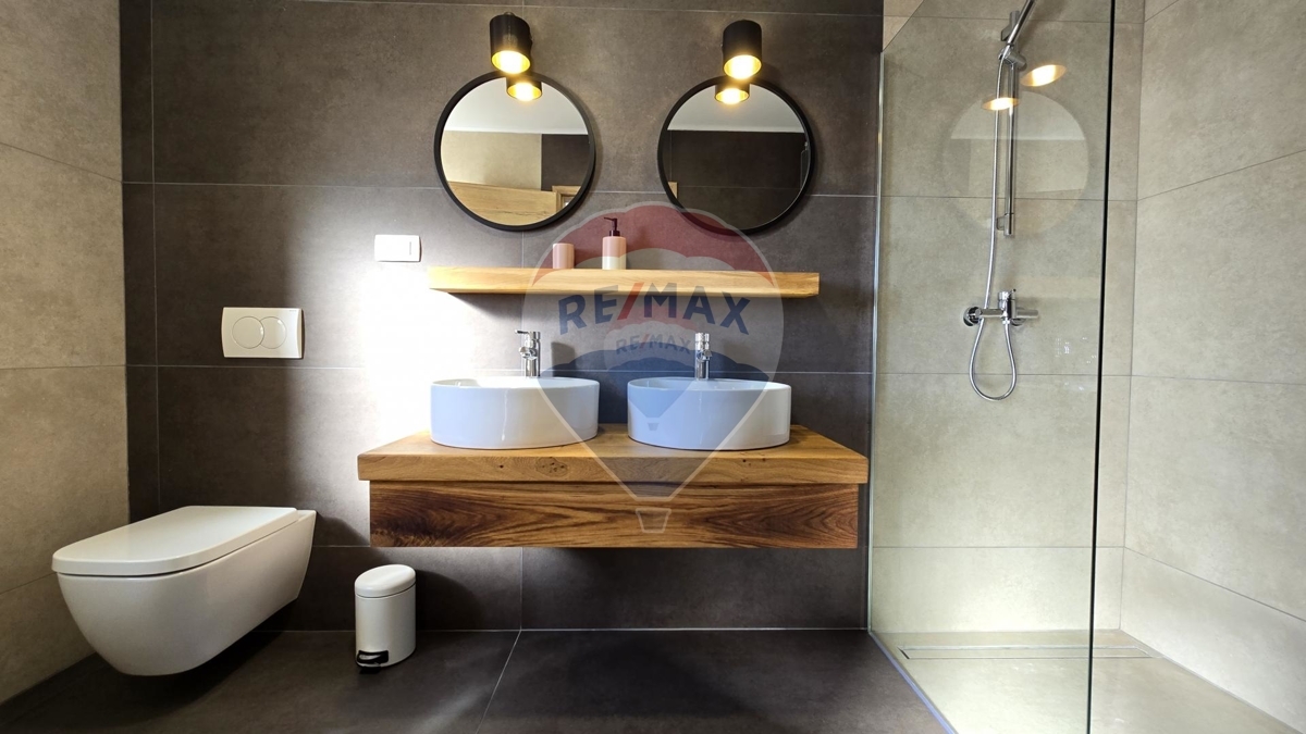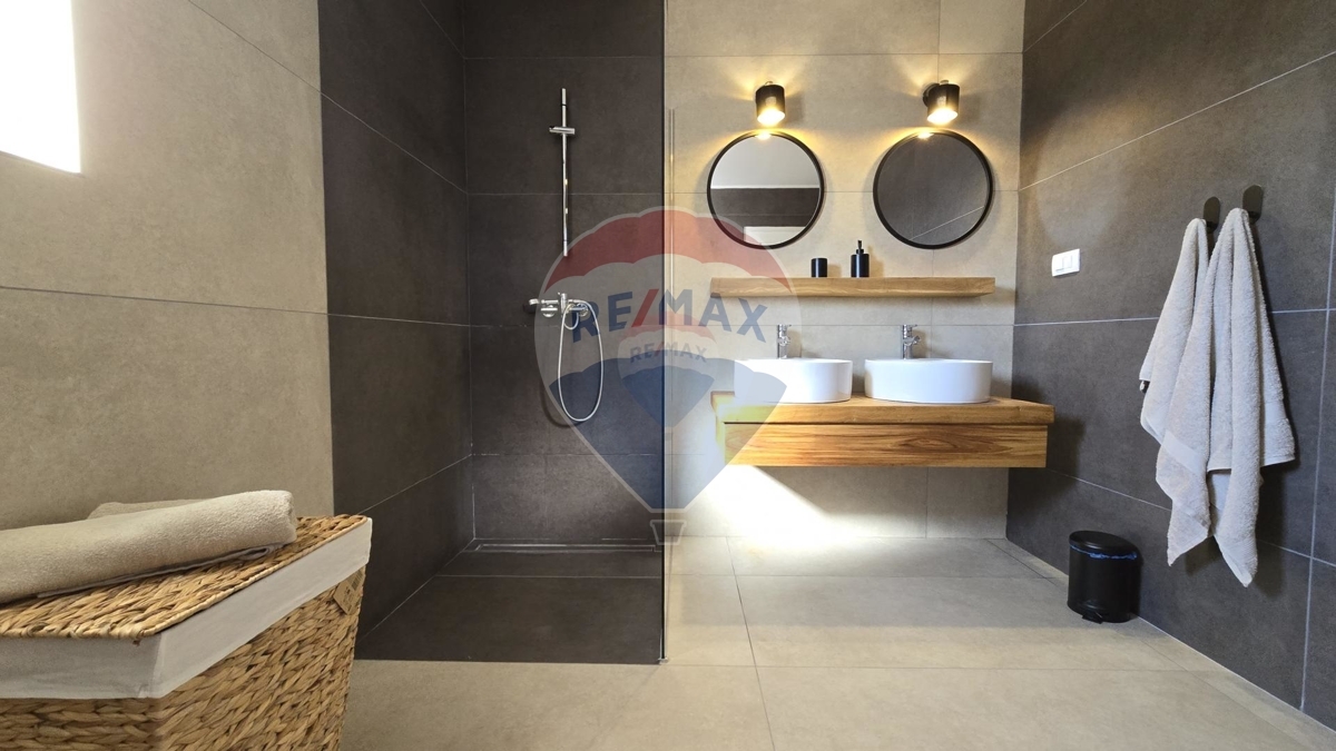 Im Erdgeschoss befinden sich zwei Schlafzimmer, ein geräumiges, helles Wohnzimmer mit einem zusätzlichen Schlafsofa für zwei Personen und eine moderne offene Küche. Das Wohn- und Esszimmer sind mit der überdachten Terrasse und Außenbereich verbunden.