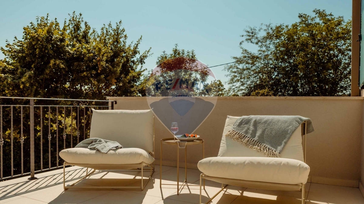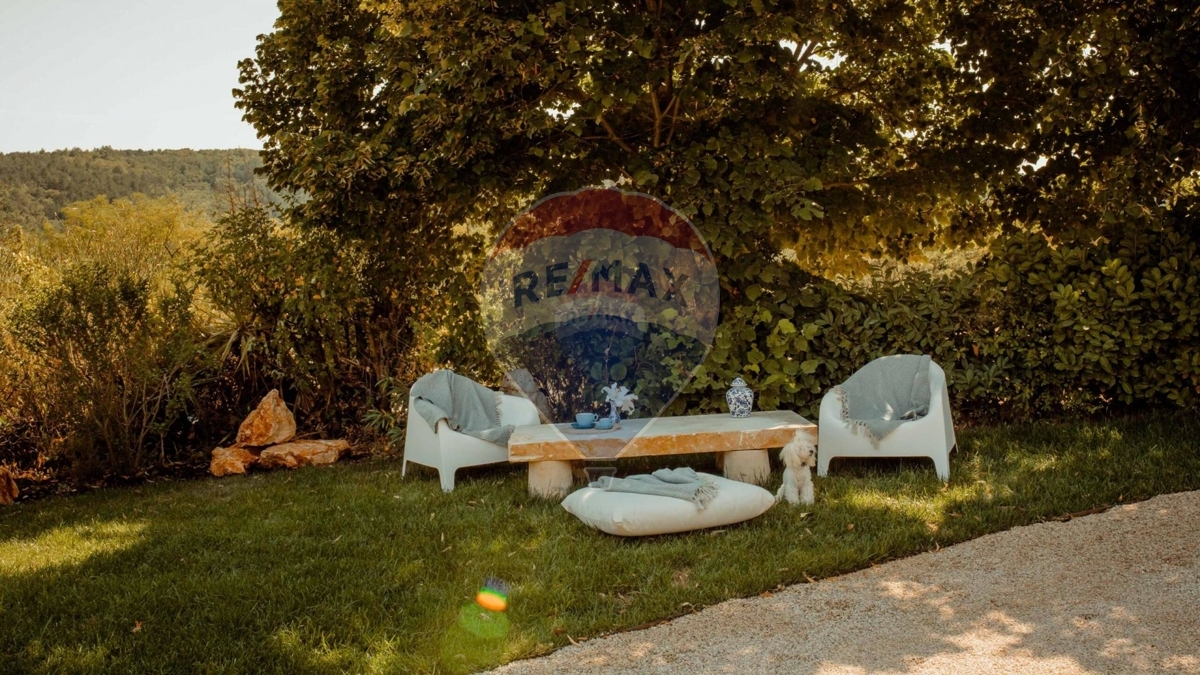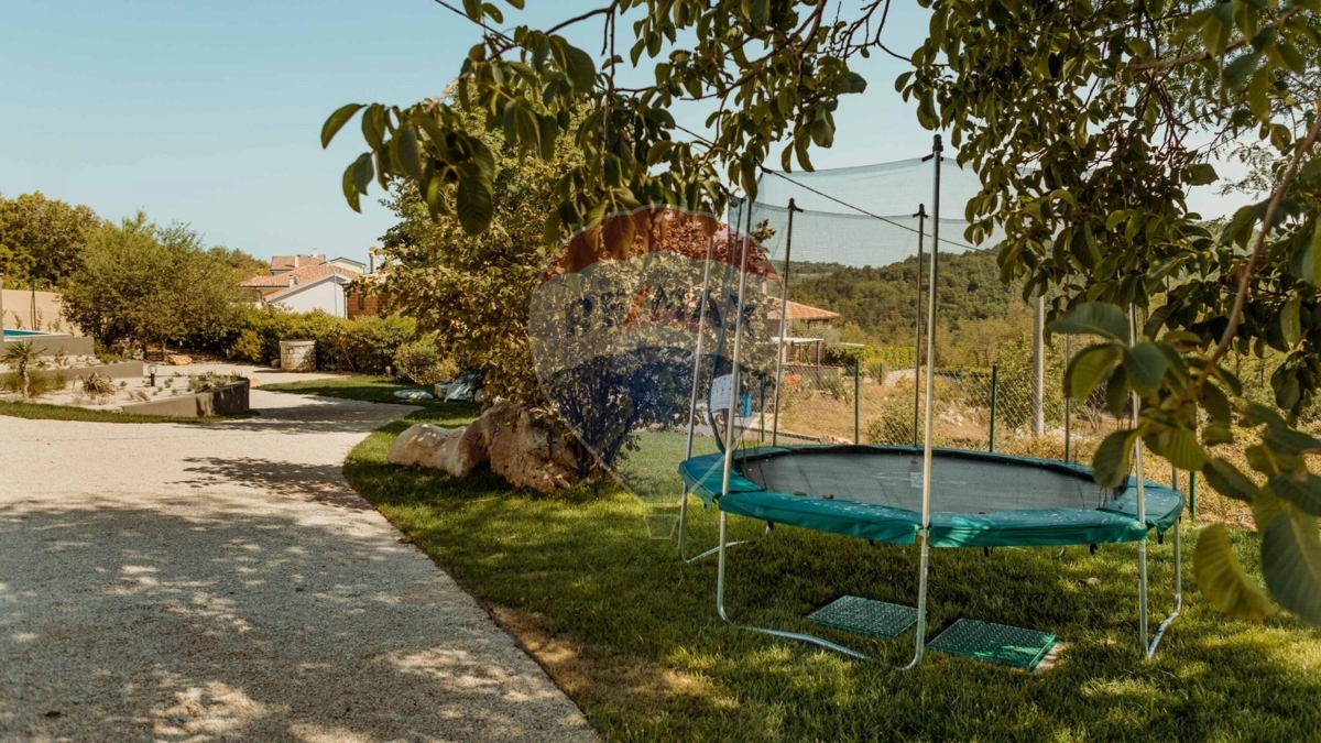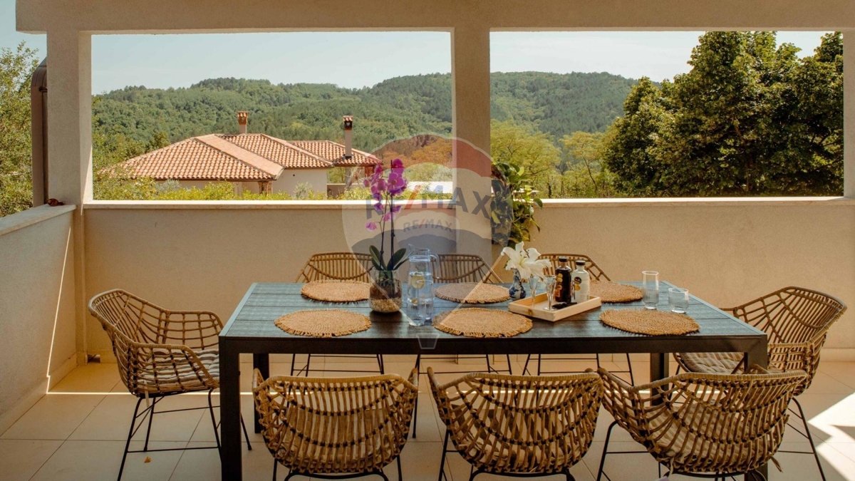 Im Außenbereich, vom Pool aus genießen Sie einen zauberhaften Ausblick auf die saftig-grüne Hügellandschaft und das alte Städtchen Oprtalj. Das gesamte Grundstück ist umfriedet, herrlich grün bewachsen mit mehreren romantischen Schattenplätzen und Ziergärten.