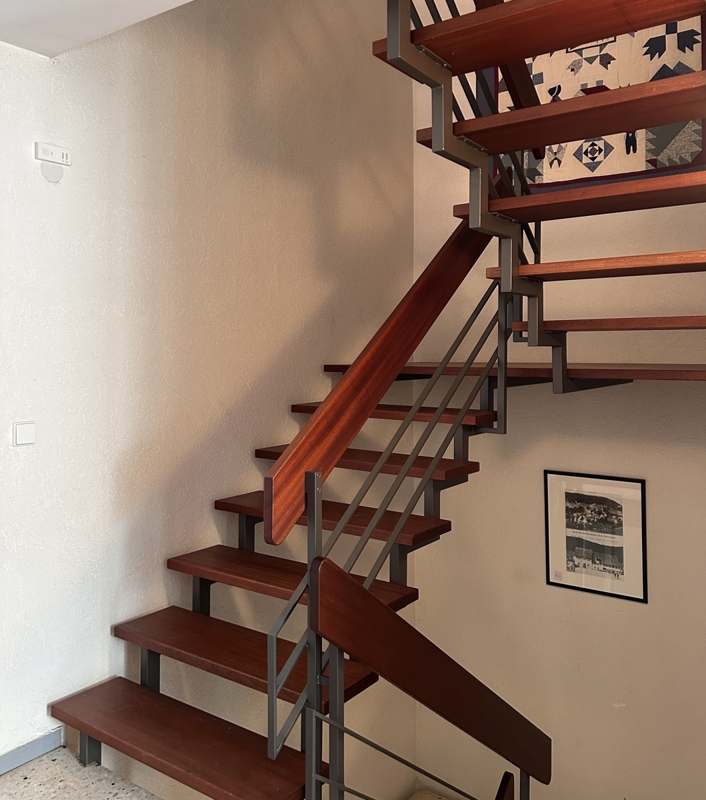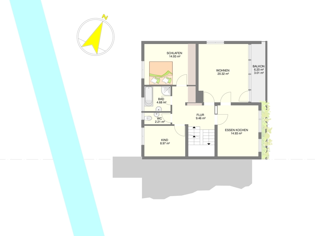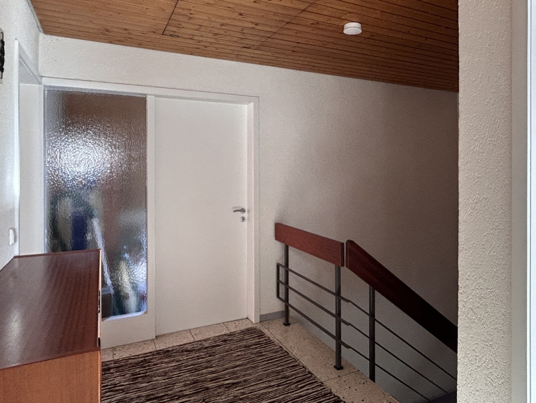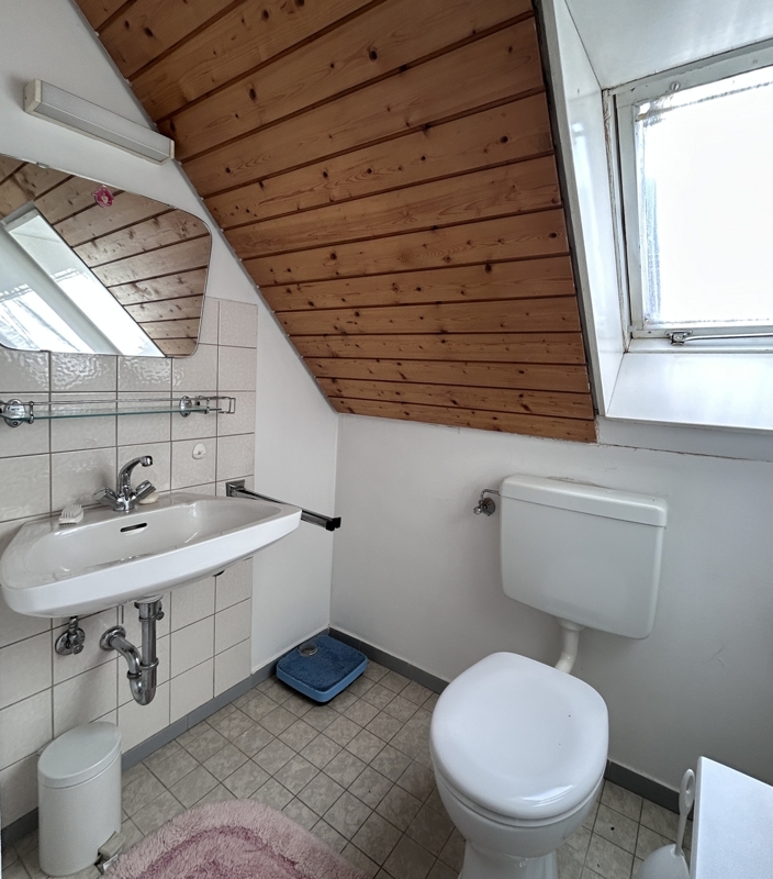 • Obergeschoss: Die Hauptwohnung verfügt über ein großzügiges Wohnzimmer mit Balkon, eine geräumige Essküche, ein Badezimmer sowie zwei Schlafzimmer.