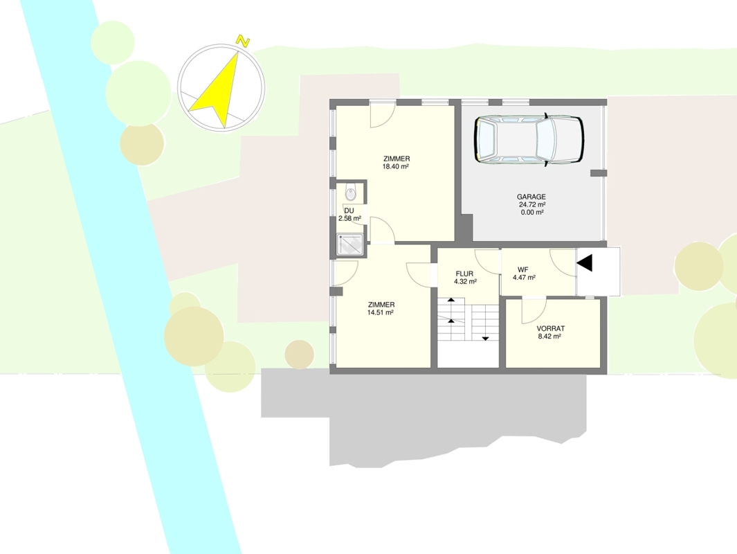 • Erdgeschoss: Hier befindet sich eine Doppelgarage sowie ein großer Abstellraum. Zusätzlich stehen zwei Räume mit direktem Zugang zum Garten sowie ein Duschbad mit WC zur Verfügung. Dieser Bereich kann zu einer separaten Wohnung umgestaltet oder als Atelier bzw. Werkstatt genutzt werden.