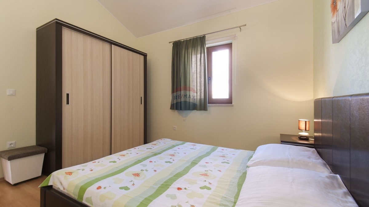 In einer ruhigen Lage in der Umgebung von Poreč liegt dieses chamante Haus. Die Randlage ermöglicht einen freien Blick ins Grüne.Im Erdgeschoss befinden sich ein einladendes Wohn- und Esszimmer mit Küche, ein Schlafzimmer sowie ein Badezimmer. Vom Wohnbereich aus gelangen Sie zur überdachten Terrasse und zum Außenbereich.