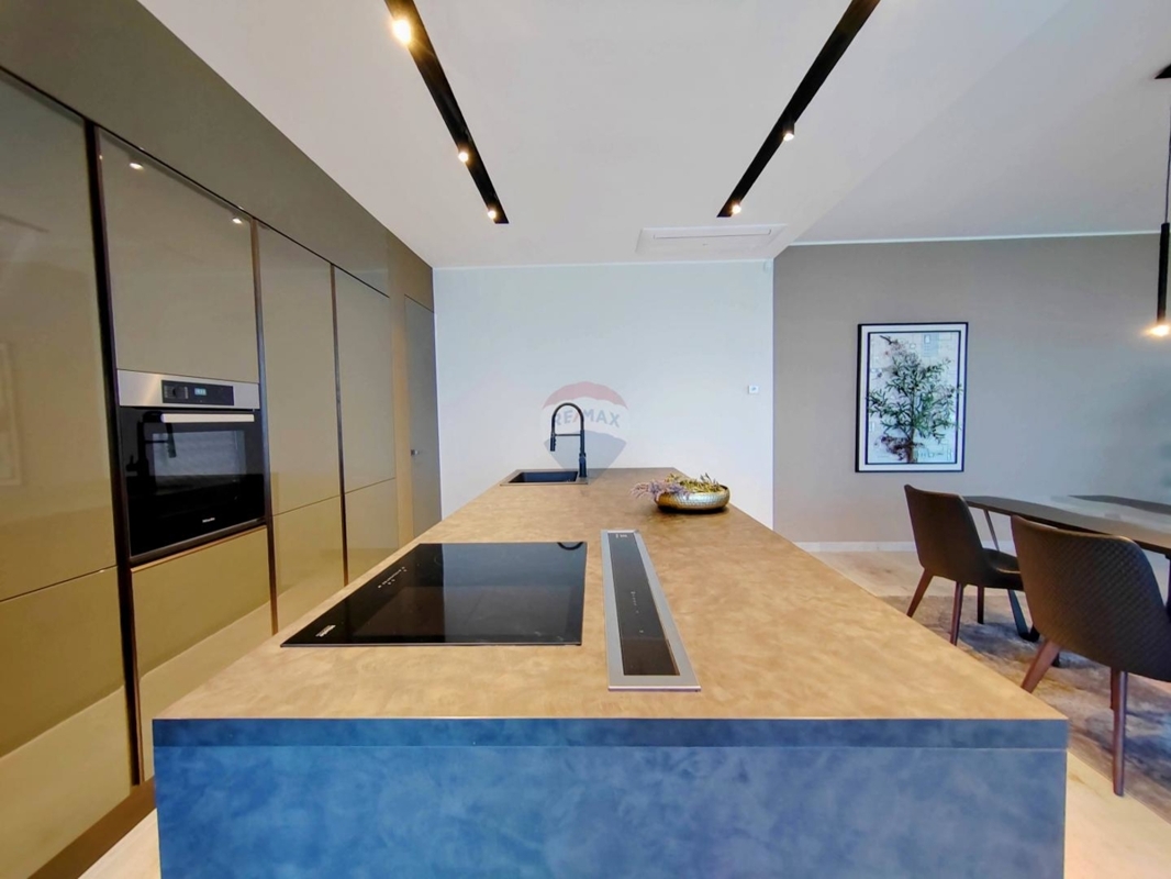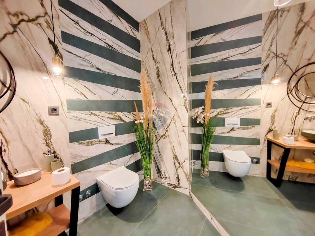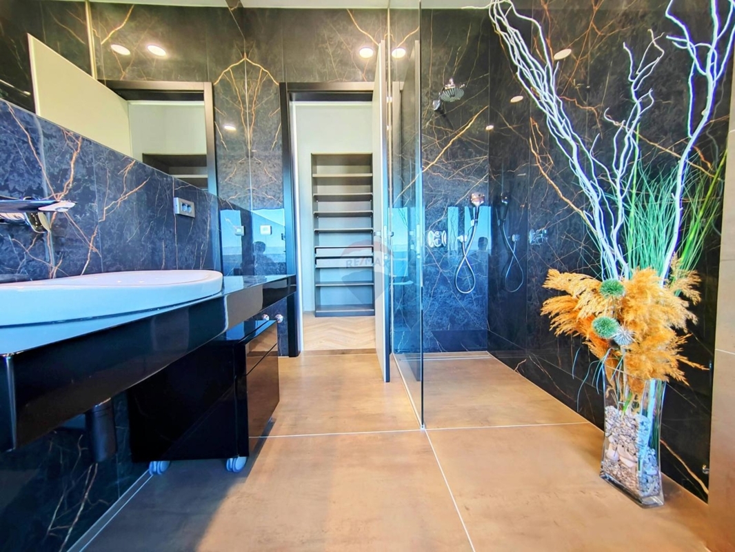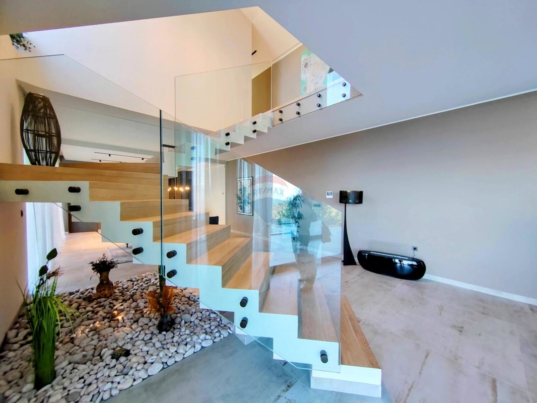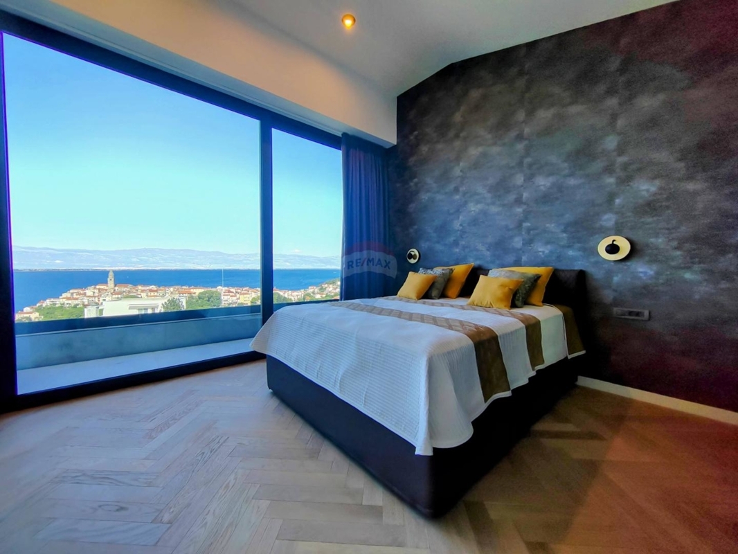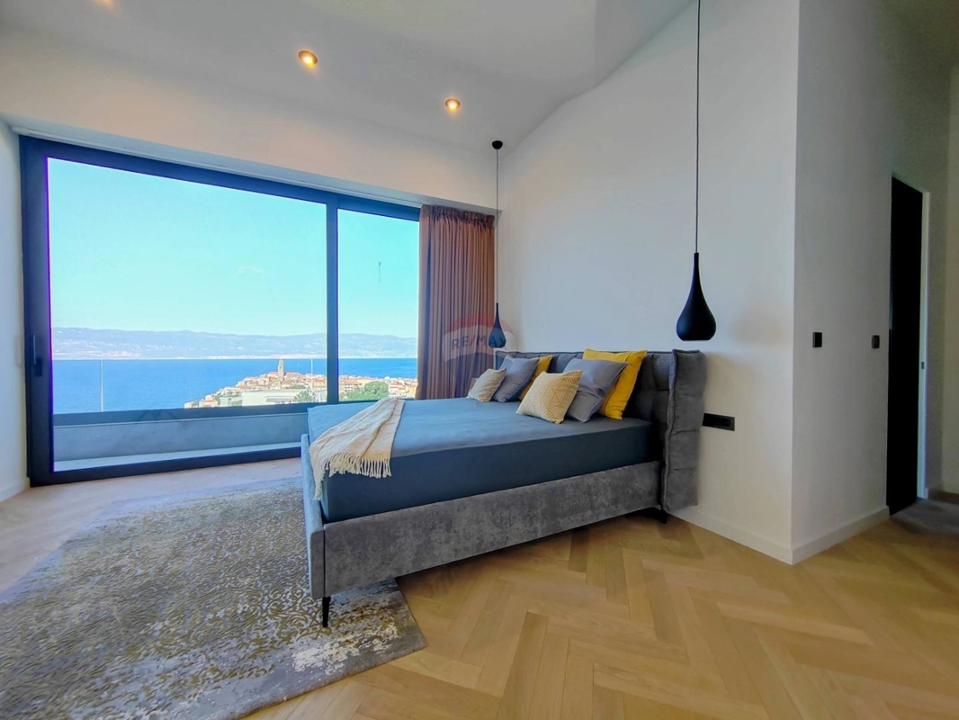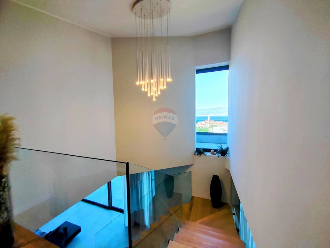 Im Obergeschoss sind drei große Schlafzimmer, jedes mit eigenem Bad und einen atemberaubenden Ausblick auf das Meer und Vrbnik – vom Bett aus. Ein Wellnessraum mit Sauna und Dusche und einem Balkon befinden sich ebenso auf dieser Etage.