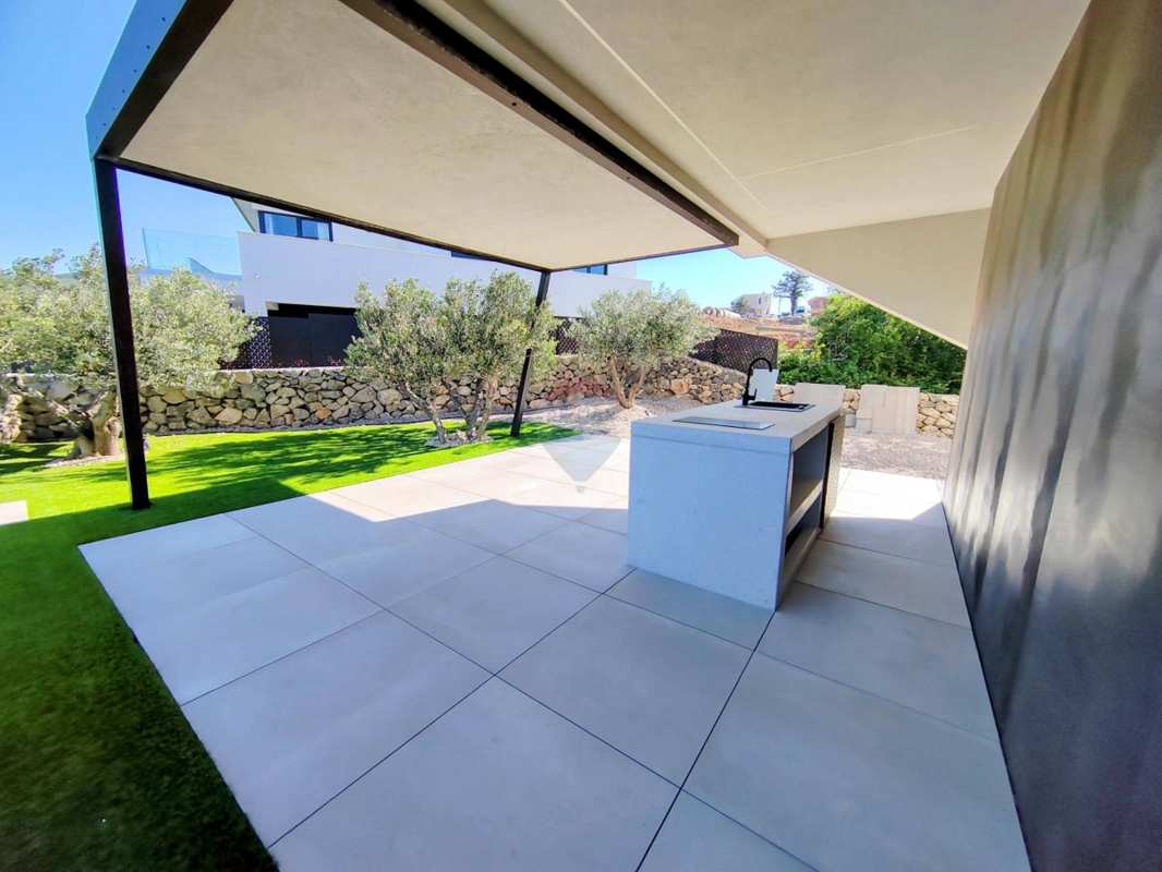 In dem Außenbereich erwartet Sie eine große Terrasse mit offenen und überdachten Bereich. Hier steht Ihnen ein 18 m langer Pool zur Vergnügung. Daneben, um die Ecke ist eine überdachte Terrasse mit Sommerküche als Kochinsel angelegt. In diesem Bereich gibt es eine schöne Gartenfläche mit Rasen und Steinmauern.