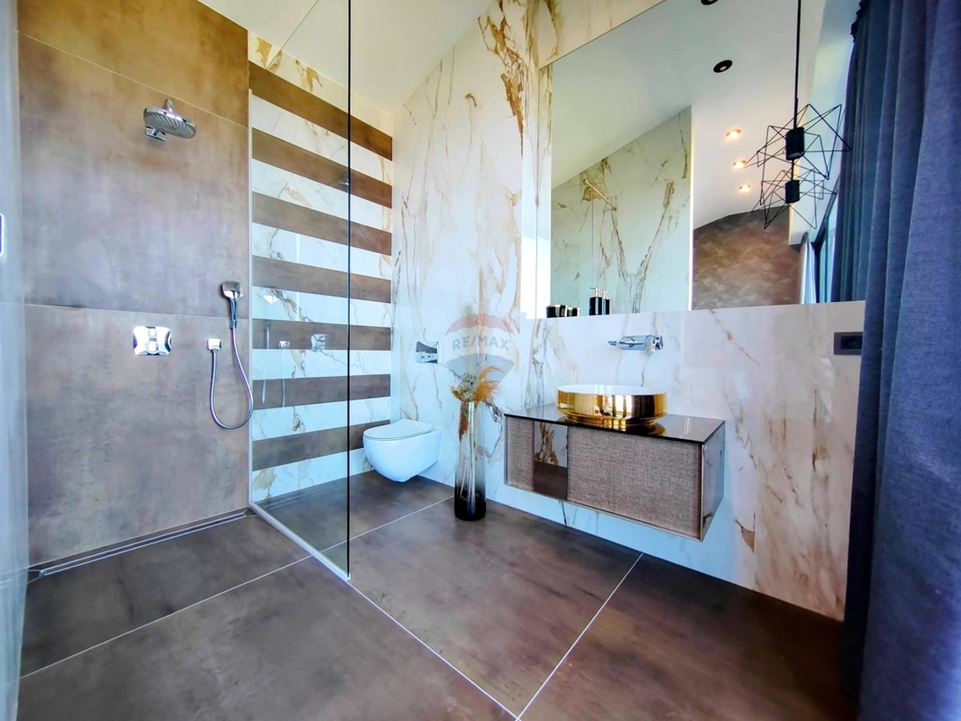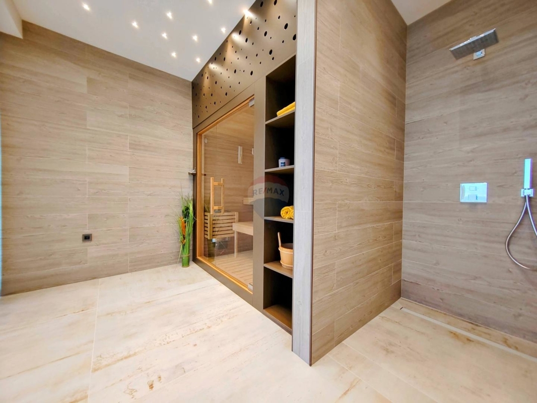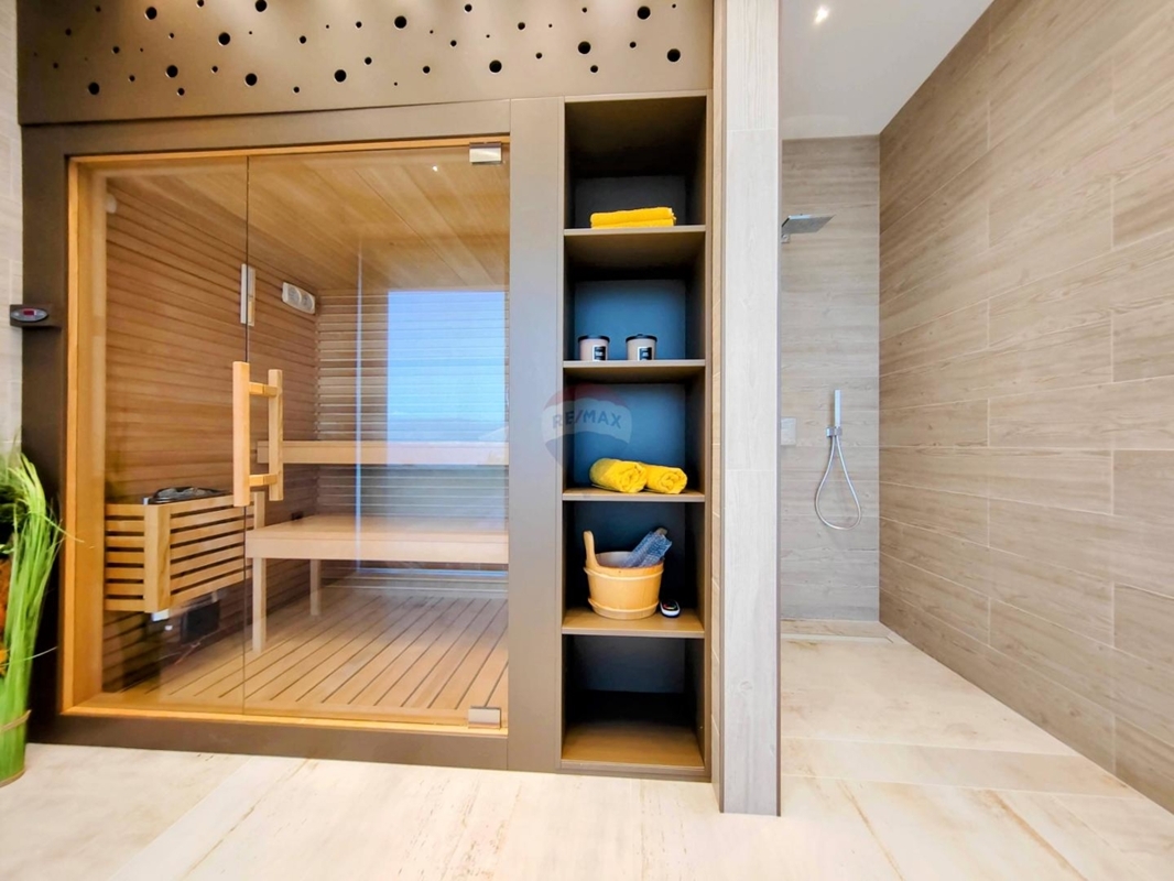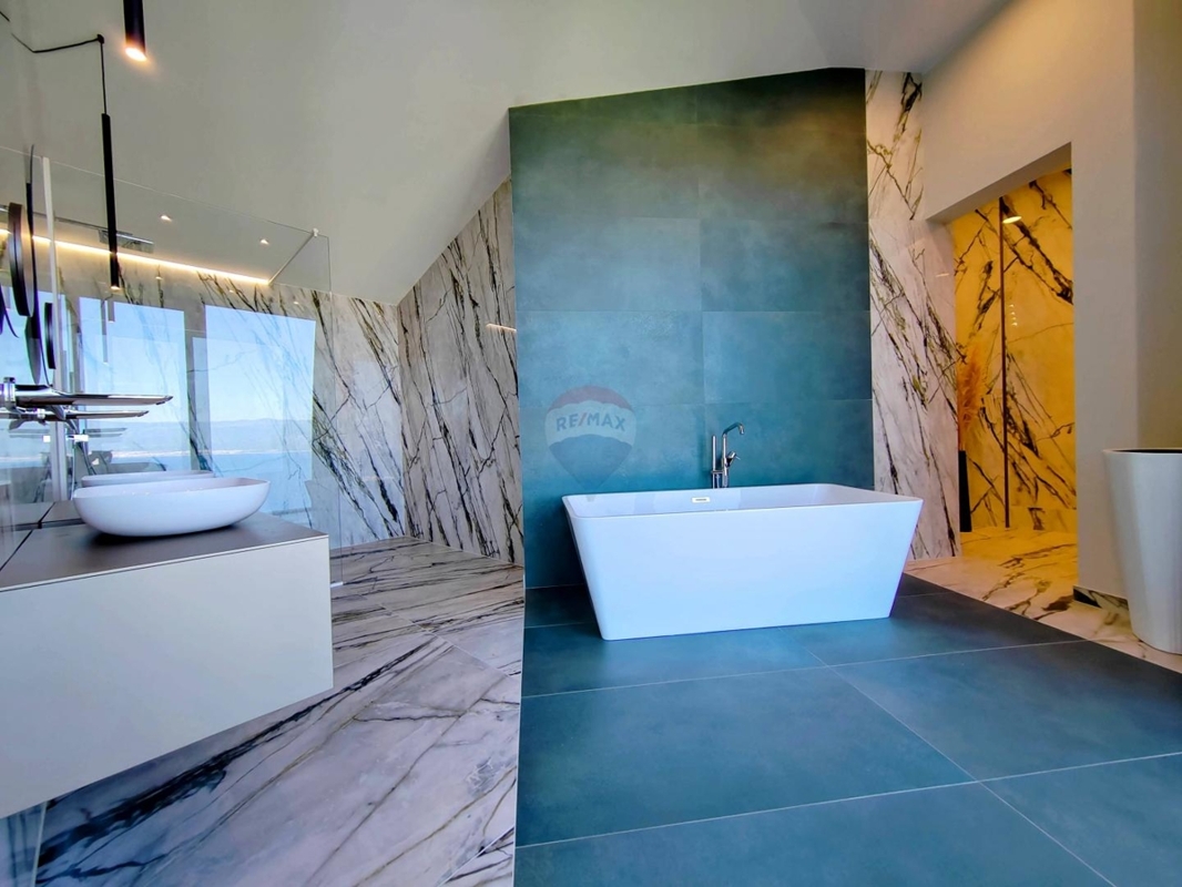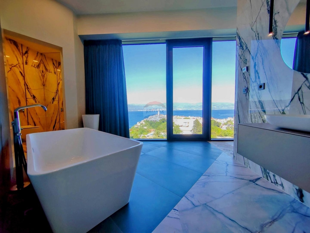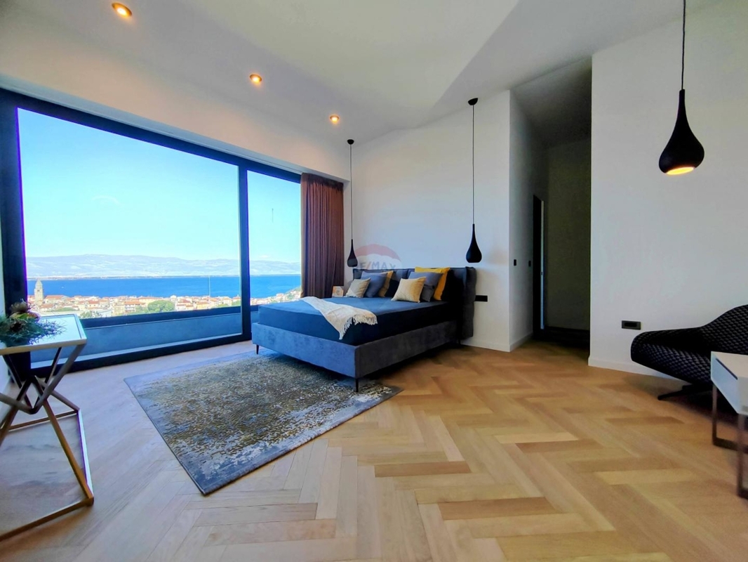 Im Obergeschoss sind drei große Schlafzimmer, jedes mit eigenem Bad und einen atemberaubenden Ausblick auf das Meer und Vrbnik – vom Bett aus. Ein Wellnessraum mit Sauna und Dusche und einem Balkon befinden sich ebenso auf dieser Etage.
