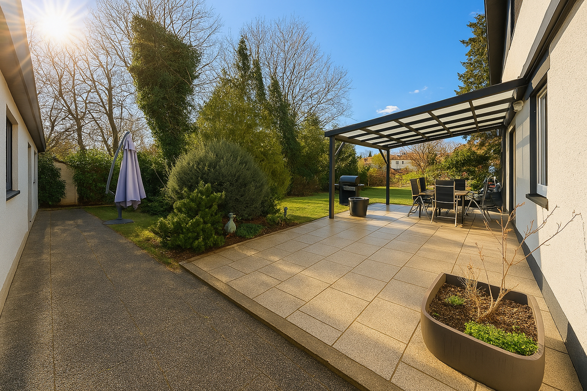 Der gepflegte Garten bietet viel Platz zum Entspannen, Spielen oder Gärtnern. Direkt am Haus lädt eine großzügige, überdachte Terrasse mit rund 28,77 m² zum Verweilen ein. Eine Garage mit zusätzlichem Geräteraum sorgt für praktischen Stauraum und rundet das Platzangebot ab. Die Lage des Objektes ist ruhig, gleichzeitig aber sehr gut angebunden und zentral gelegen.