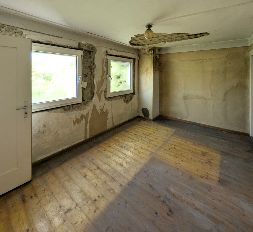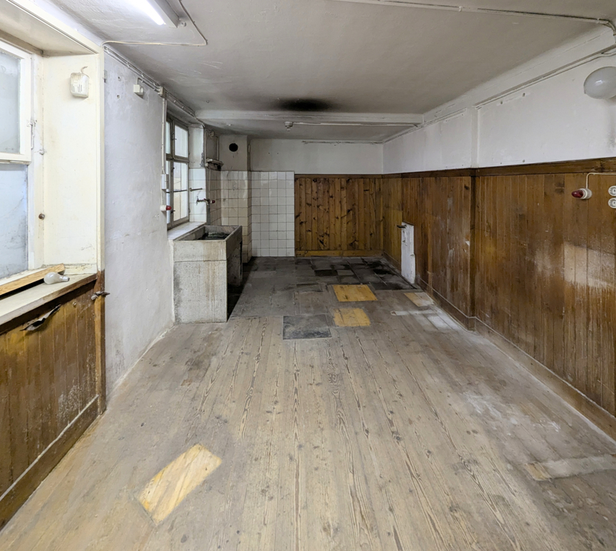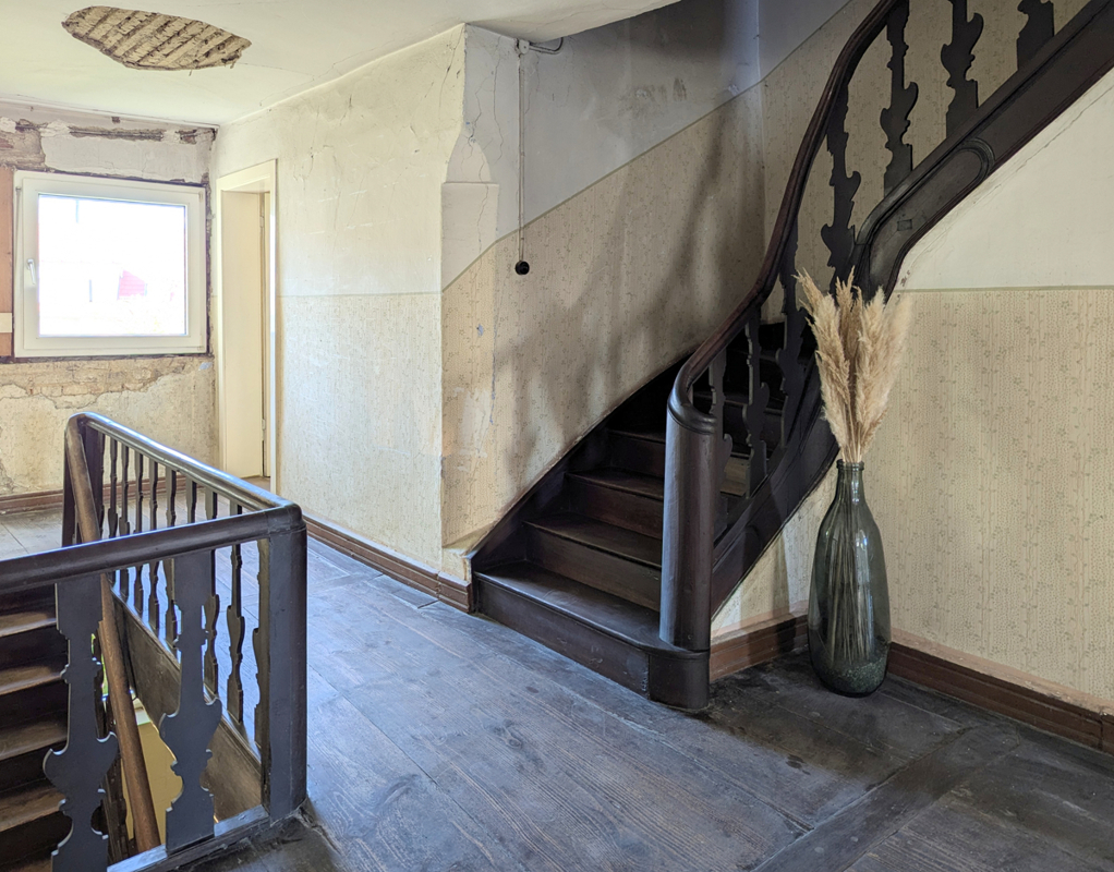 Der Zustand des Hauses ist als sanierungsbedürftig zu bewerten. Eine umfassende Kernsanierung ist ratsam, um die architektonischen Besonderheiten zu bewahren und gleichzeitig modernen Wohn- und Geschäftsansprüchen gerecht zu werden. Das Dach wurde zuletzt 1976 mit Eternit-Europadachplatten eingedeckt – auch hier ist eine Erneuerung anzuraten. Das Gebäude ist zu etwa zwei Dritteln unterkellert, wobei der Gewölbekeller einen soliden Eindruck hinterlässt und zusätzliche Nutzungsmöglichkeiten bietet. Das Gebäude wurde in der Vergangenheit mittels einer Vielzahl an Einzelöfen beheizt, diese wurden bei der Räumung entfernt, sodass ein modernes und nachhaltiges Heizungskonzept direkt installiert werden kann.