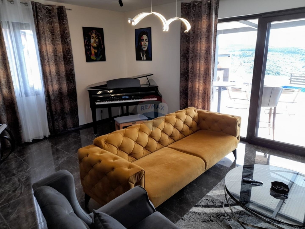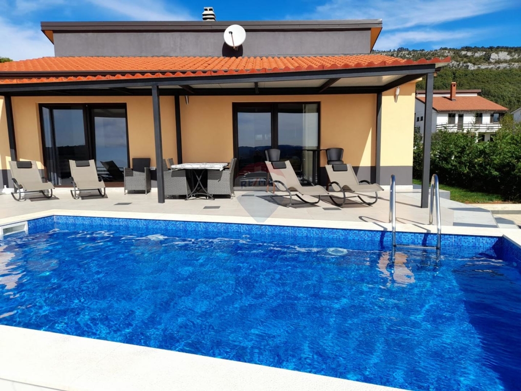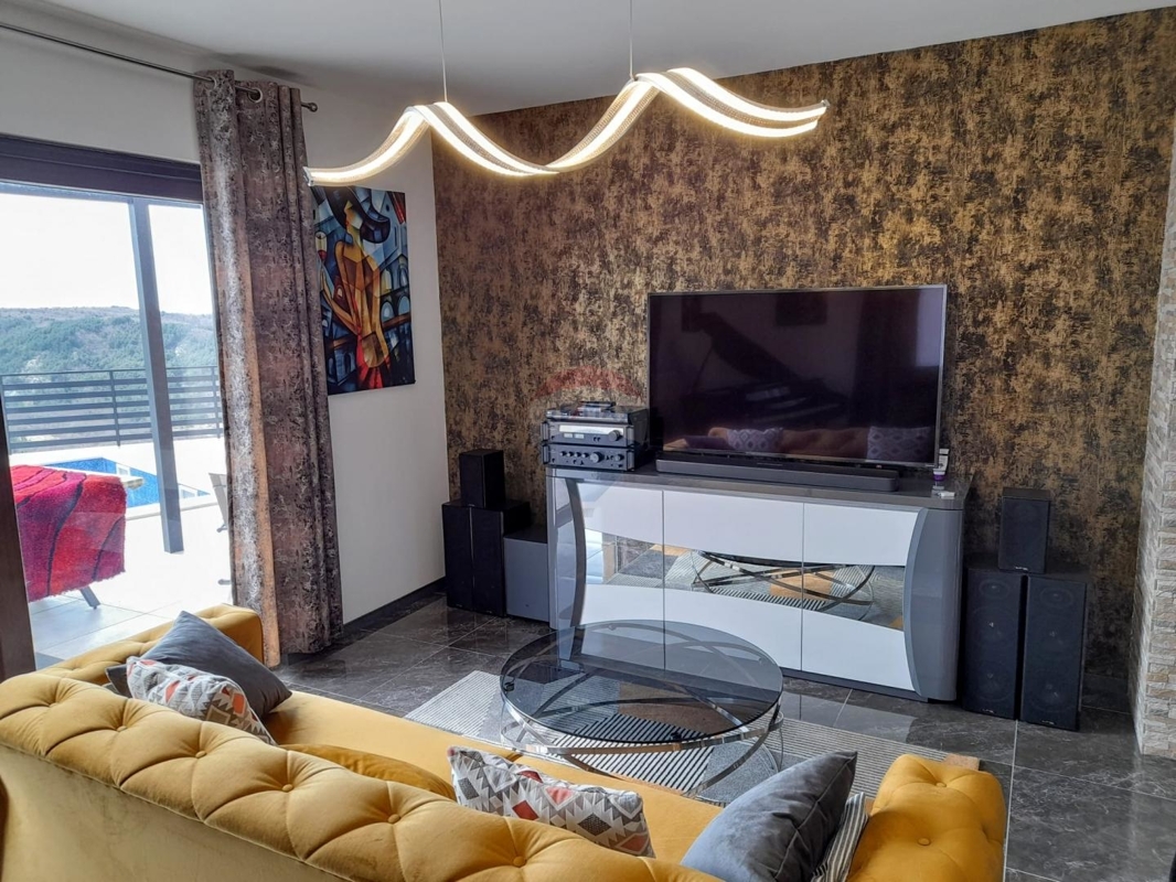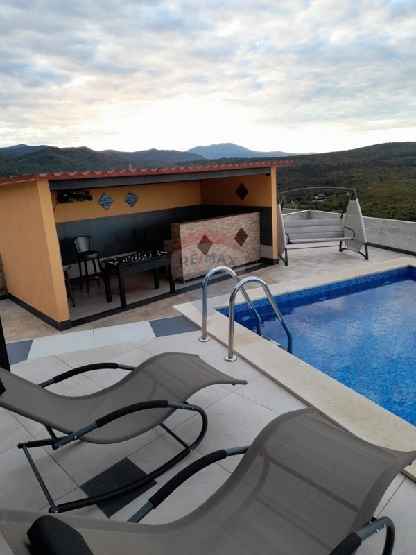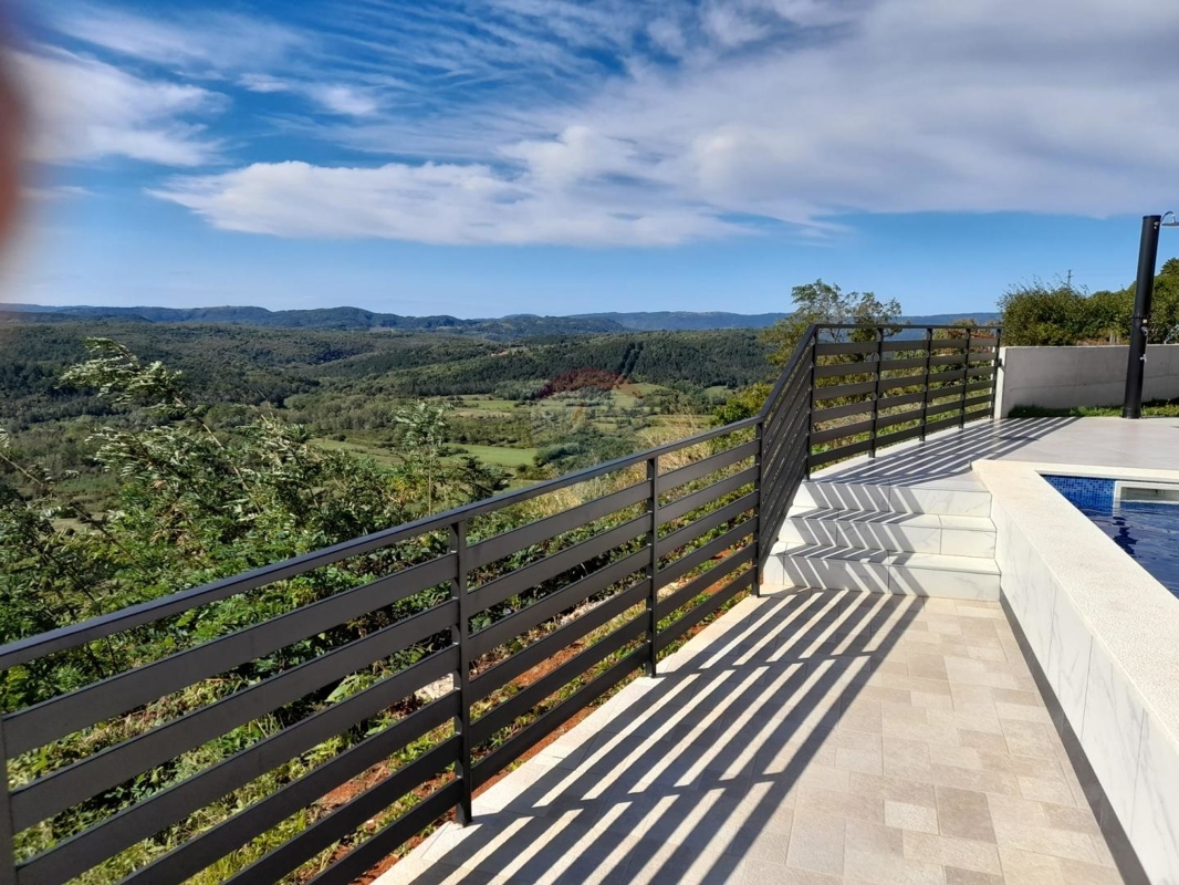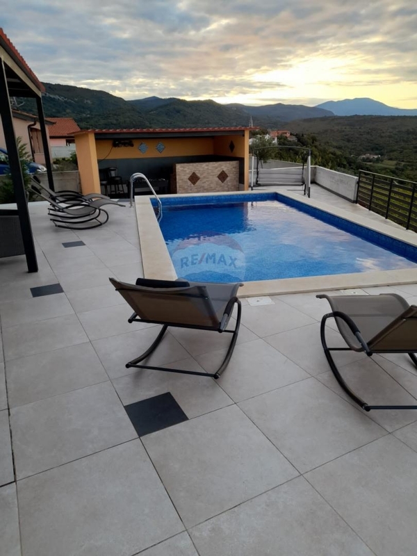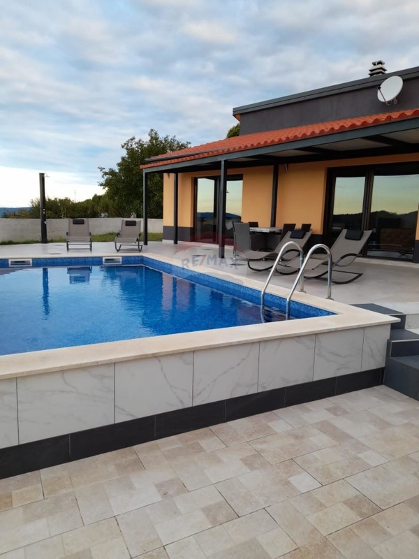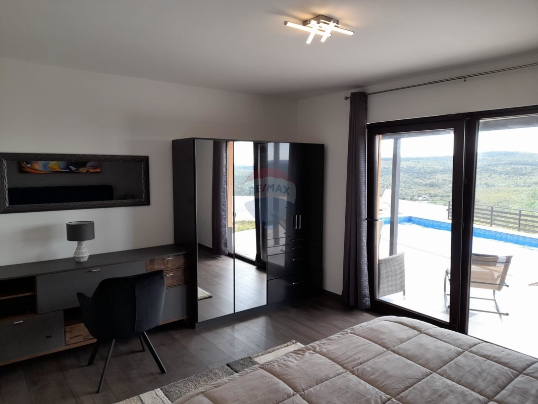 In wunderschönen Lage steht dieses Ferienhaus mit Pool und Ausblick in die fernen Berge Istriens und bietet Ihnen absolute Ruhe und Privatsphäre fern ab der Küstenstädte.Im Ferienhaus dominiert das einladende Wohnzimmer mit direktem Zugang zur überdachten Terrasse, zwei Schlafzimmer, eins davon mit direktem Zugang zum Außenbereich, Küche, Esszimmer, Badezimmer und Flur.
