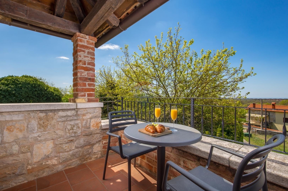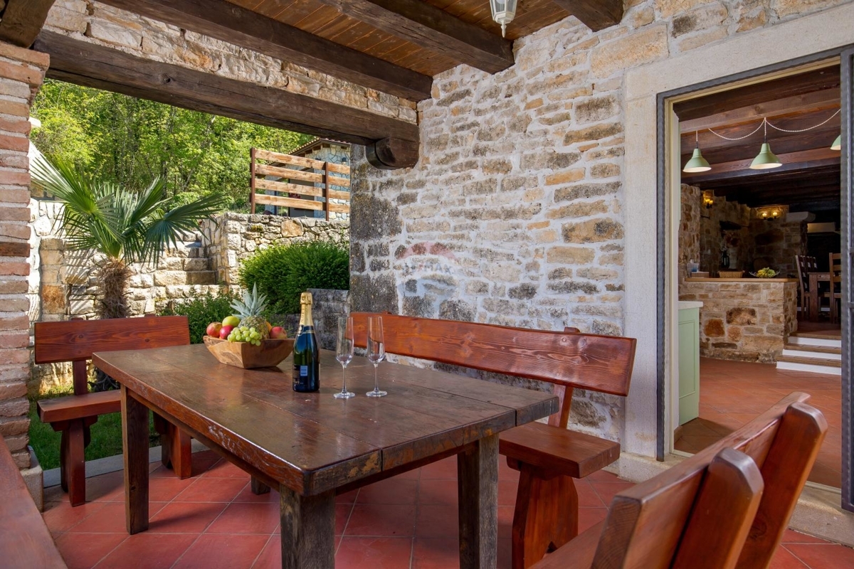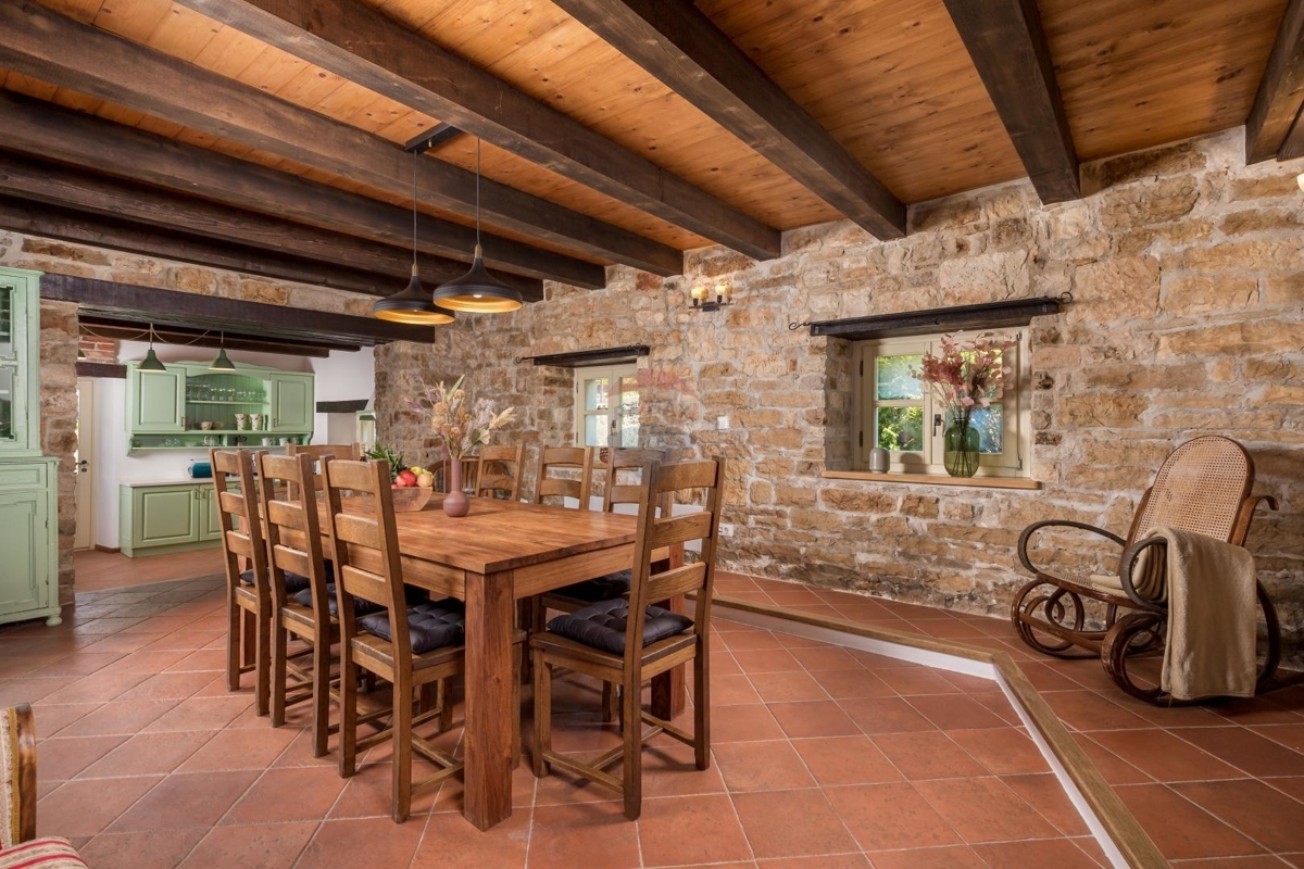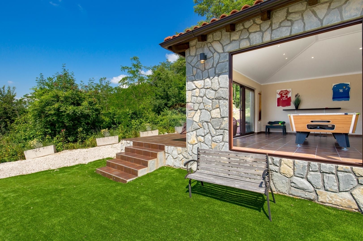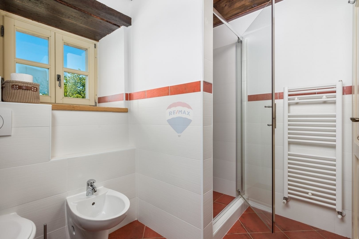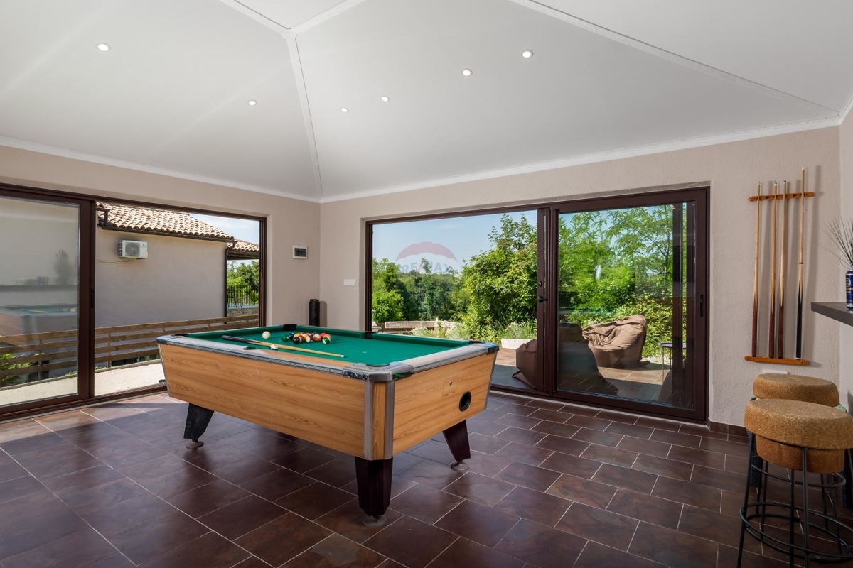In der idyllischen Umgebung des Porečer Hinterlandes liegt diese Villa – ideal für Naturliebhaber und alle die sich nach Erholung und Ruhe sehnen.Das Grundstück von über 800 m² bietet eine reine Fläche der Außenanlage von 700 m². Hier befinden sich ein Pool, mehreren Terrassen, Rasenfläche, Steinkamin-Grill sowie ein Nebengebäude, das als Spielzimmer eingerichtet ist.