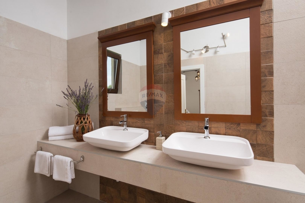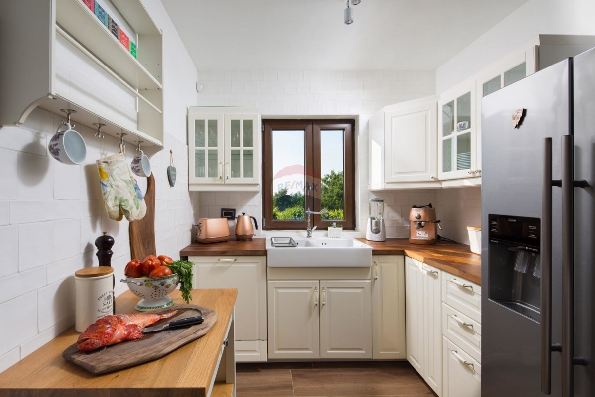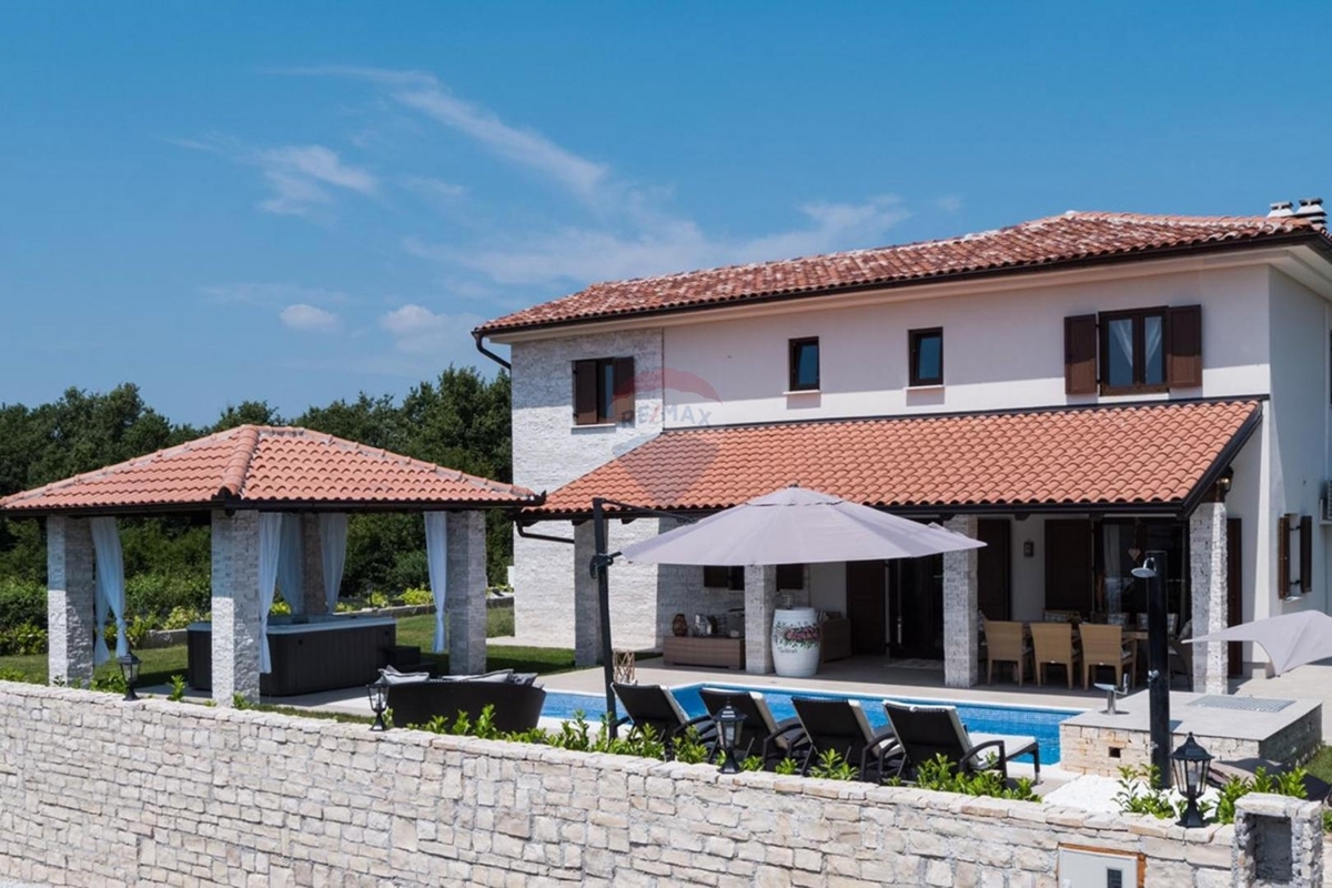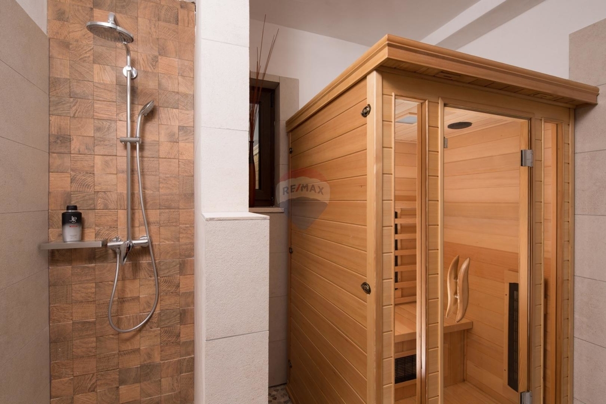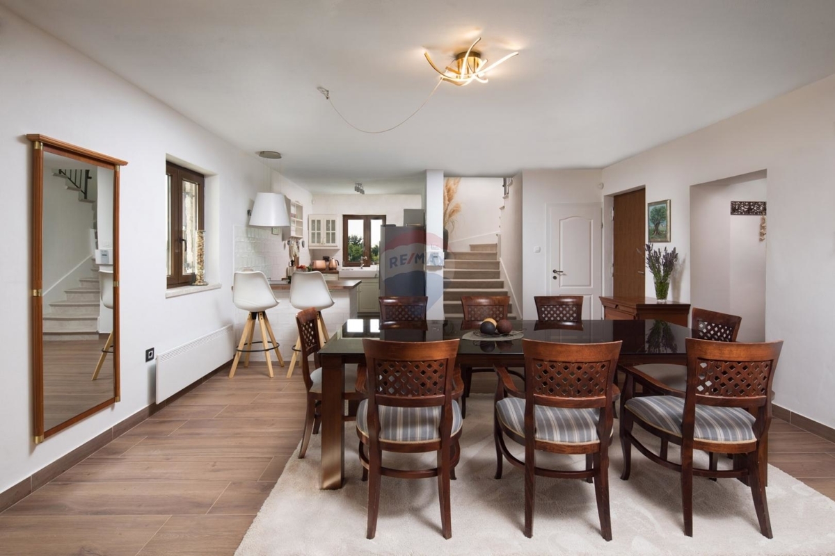 In der Idyllischen Umgebung von Poreč liegt diese charmante istrische Steinvilla. Die Lage am Rand der Siedlung bietet nach Westen einen freien Blick auf die Natur und Weinberge.Im Erdgeschoss befindet sich das Wohn- und Esszimmer verbunden mit der Küche. Dieser Bereich ist mit der überdachten Terrasse und dem Außenbereich verbunden. Weiter auf dieser Etage finden Sie in einem Raum eine kleine private Vinothek sowie einen Raum mit Sauna und Bad.