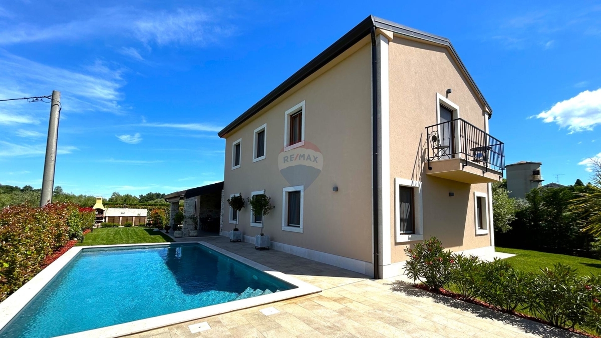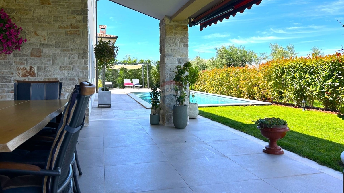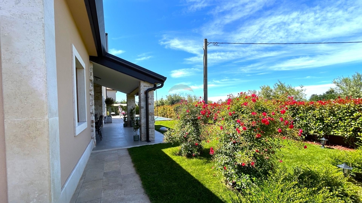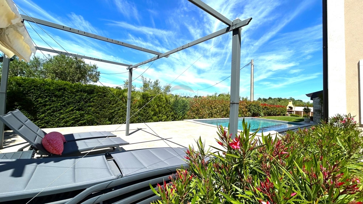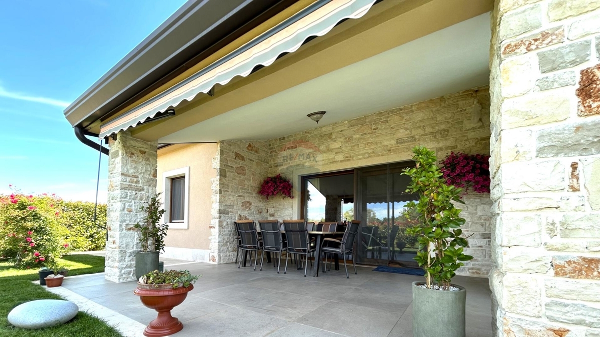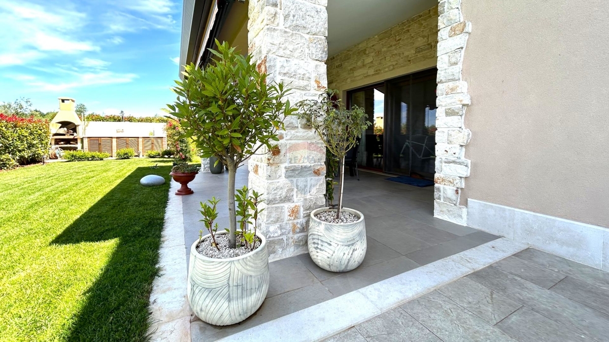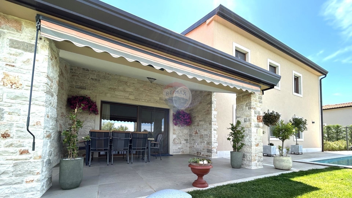 In einer ruhigen, familiären Umgebung, am Ortsrand bei Novigrad liegt diese neue, charmante Villa. Das Grundstück ist mit hohen Hecke umgeben, die Ihnen Privatsphäre bietet, dazu grenzt der vordere Außenbereich an den benachbarten Gartenbereich und Olivenfeldern.Im Erdgeschoss dominiert das große Wohnzimmer mit Küche und Essbereich, das mit der überdachten Terrasse verbunden ist. Daneben befinden sich zwei Schlafzimmer und ein Badezimmer. Auf dieser Etage gibt es auch eine Gäste-Toilette sowie einen Technik- und Abstellraum.