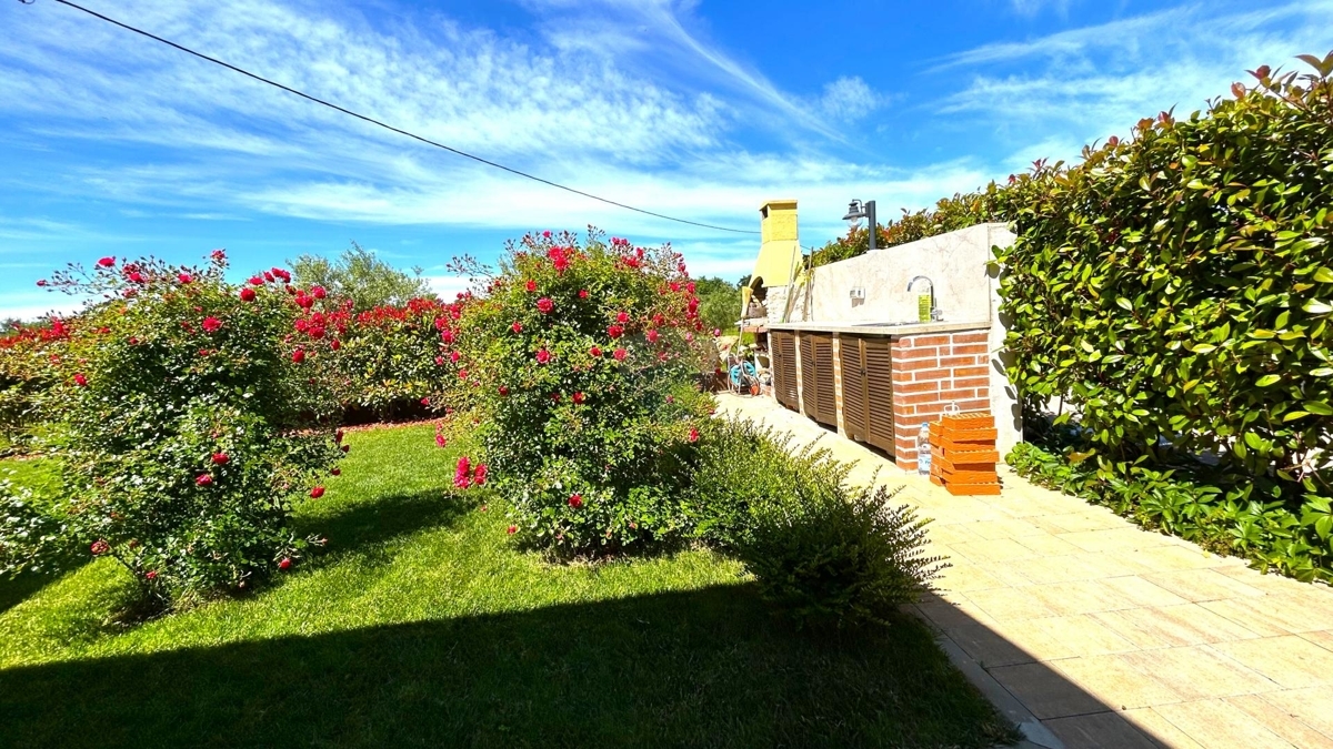 Das Grundstück ist charmant mir Rasen und Zierpflanzen angelegt. Neben dem Pool gibt es Sonnenterrasse und eine Außendusche.