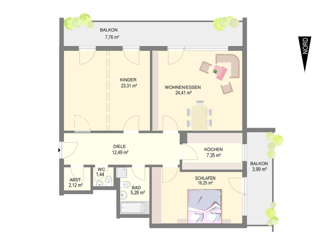 • Zwei große Balkone – jedes Zimmer hat Zugang zu einem Balkon